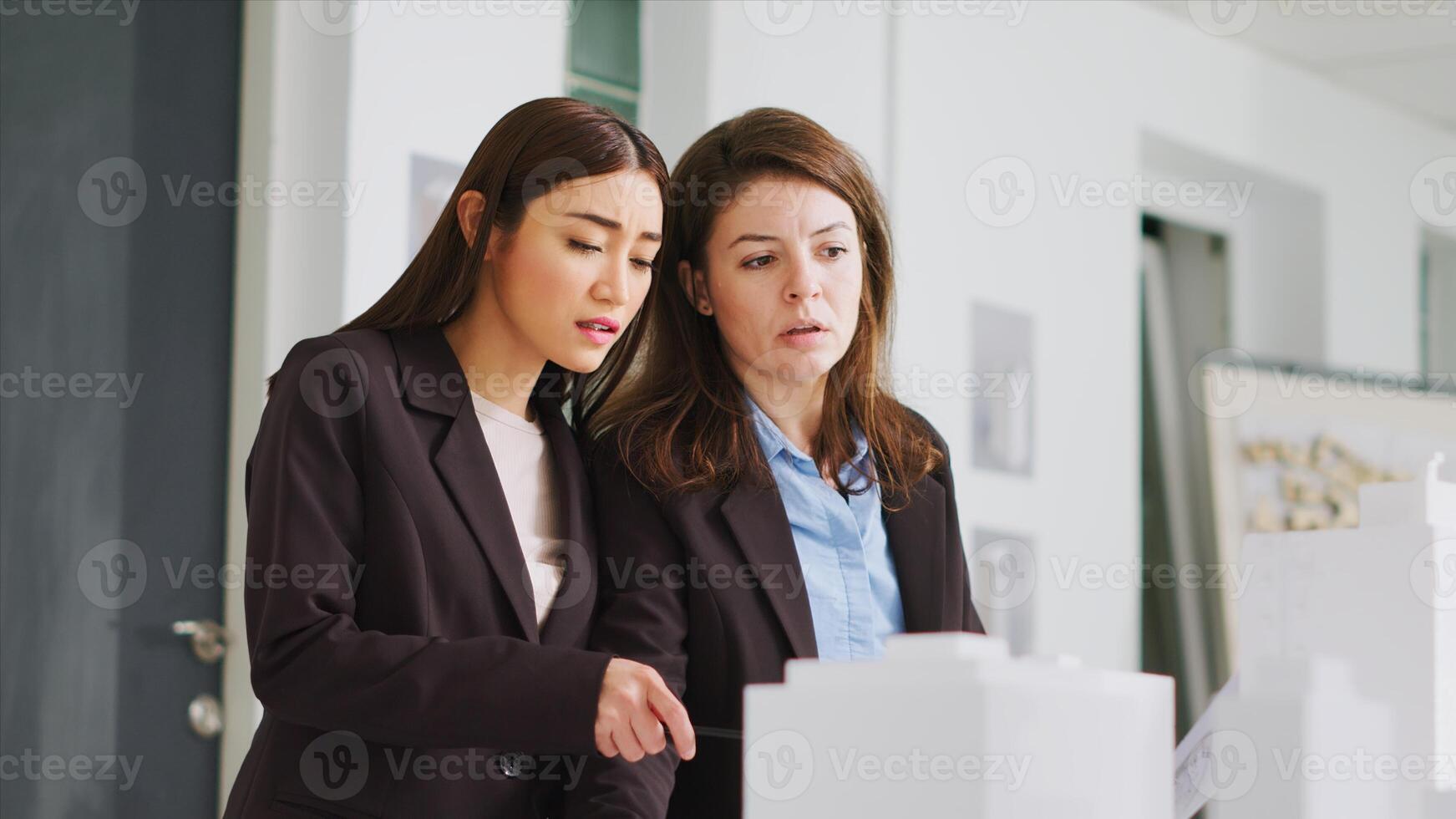 Engineers team analyzes 3d printed model to calculate dimensions, working together on unicorn business development plans. Women architects creating blueprints with measurements. Tripod shot. Pro Photo