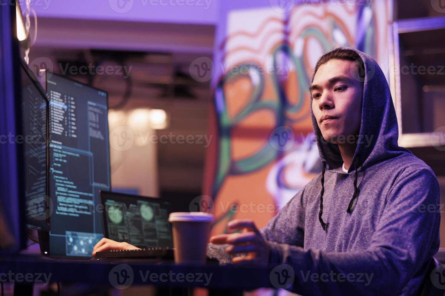 Asian hacker drinking coffee to go and hacking computer network system. Internet criminal in hood taking paper mug while coding illegal malicious software and breaking law Pro Photo