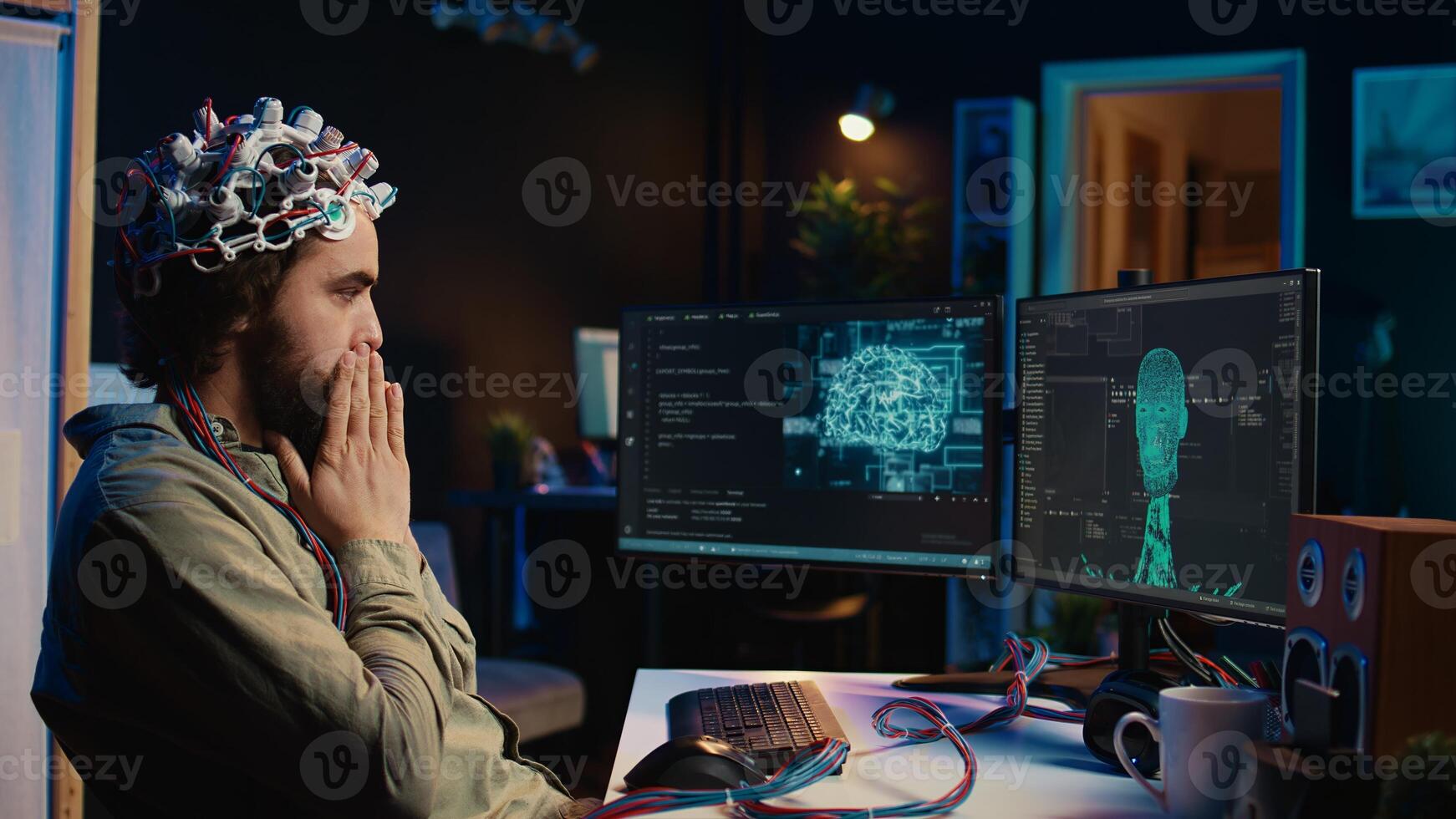 IT technician using EEG headset stupefied after mind upload virtual process is successful. Man astounded after achieving goal of transferring consciousness into computer cyberspace, camera B Pro Photo