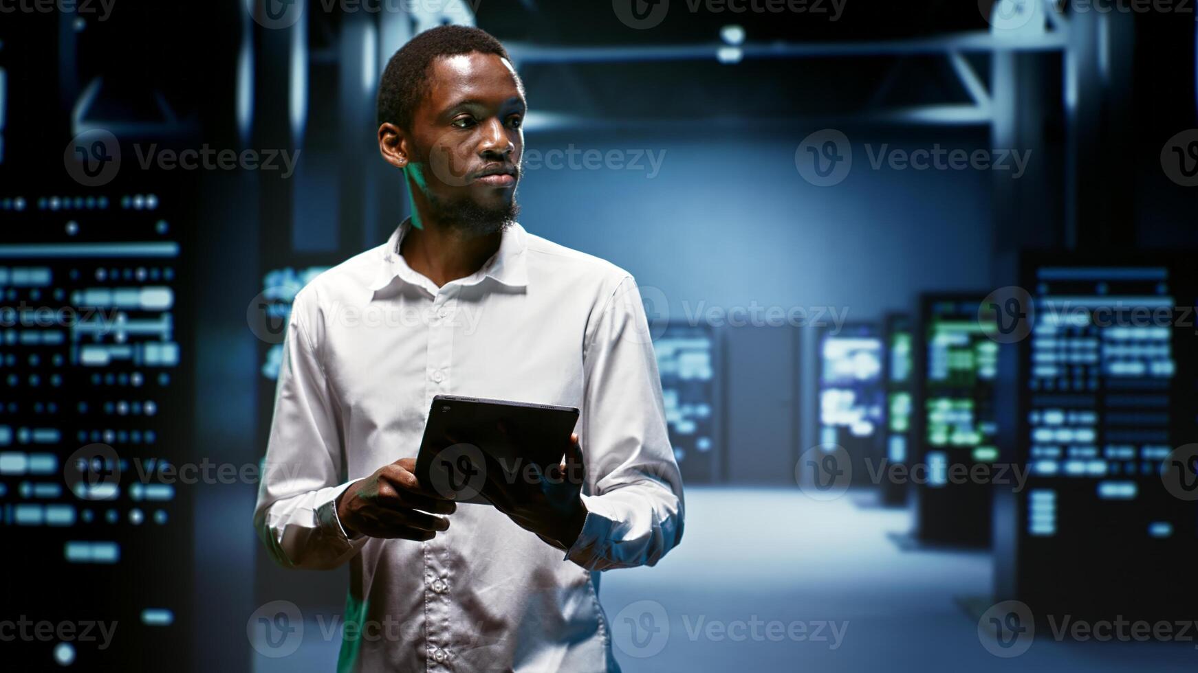 Smiling technician doing checkup in server room providing vast computing resources and storage, enabling artificial intelligence to process massive datasets for training and inference Pro Photo