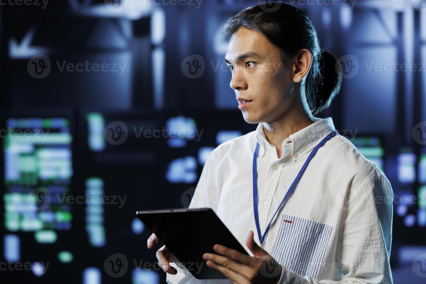 IT consultant with tablet between server hub clusters providing processing resources for businesses worldwide. Diligent worker fixes data center mainframes tasked with managing massive databases Pro Photo