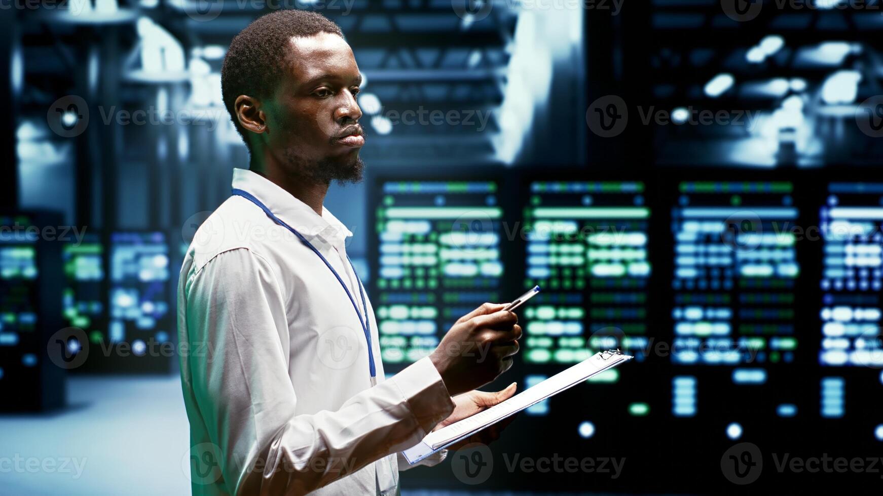 IT programmer using clipboard to assess supercomputer cybersecurity dangers arising due to unsecured network connections. Supervisor making sure high tech facility is invulnerable to malware attacks Pro Photo