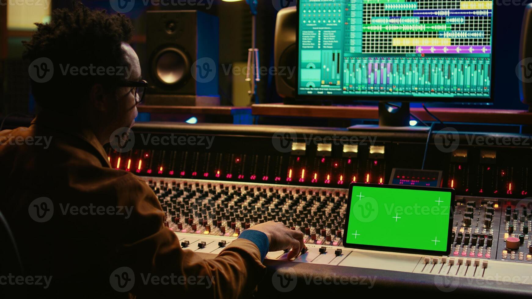 Sound engineer expert recording audio tracks next to tablet mockup, adding sound effects on songs with mixing console. Producer pressing buttons and sliders in control room. Camera B. Pro Photo