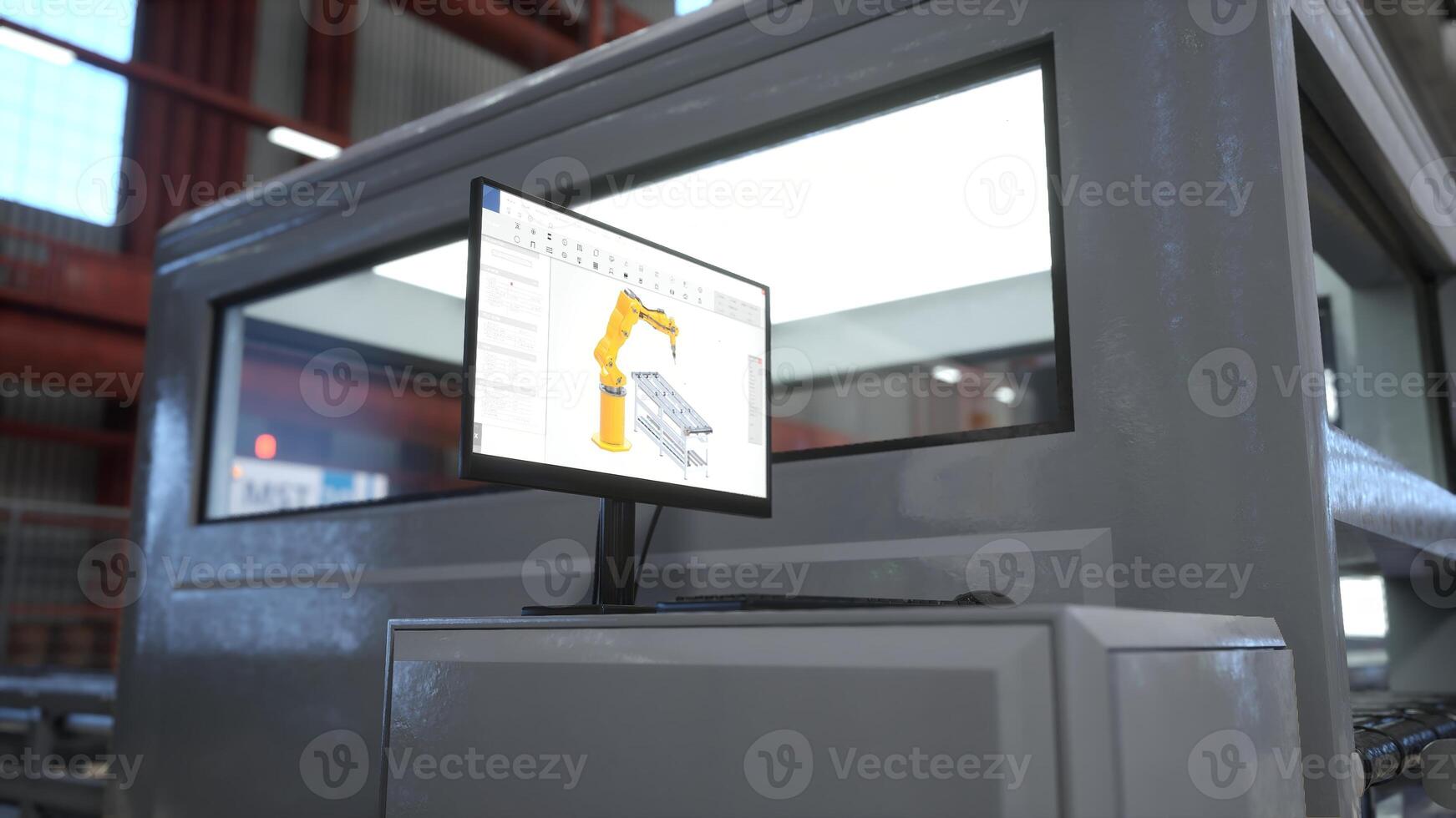 Focus on PC monitor showing controls for large machine in blurry background in warehouse. Close up on computer display used to perform tasks on CNC machinery in factory, 3D render Pro Photo