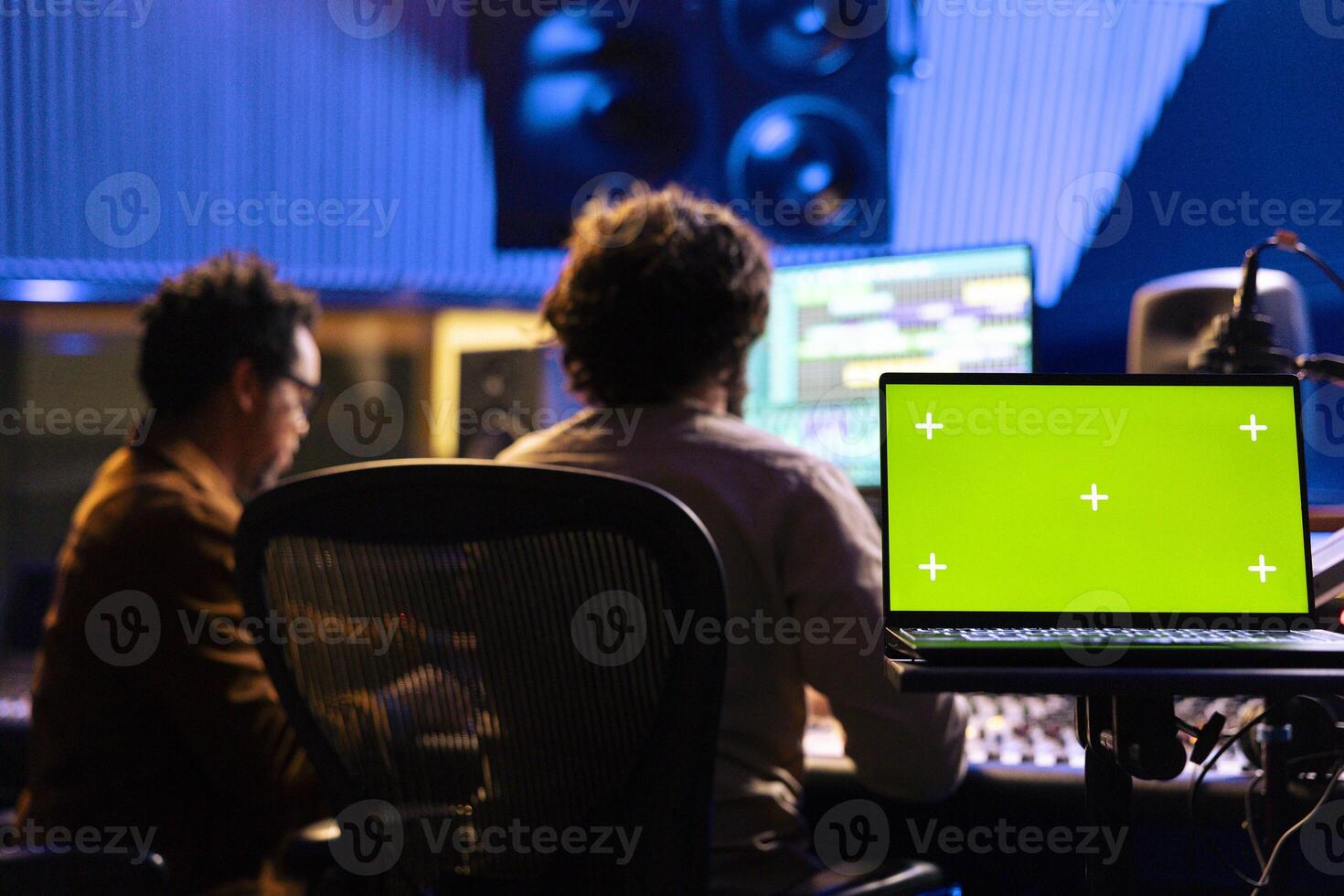 Artist and producer collaborating on a new track with greenscreen on laptop, pressing buttons and sliders to add sound effects in control room. Sound engineer mixing and mastering records. Pro Photo