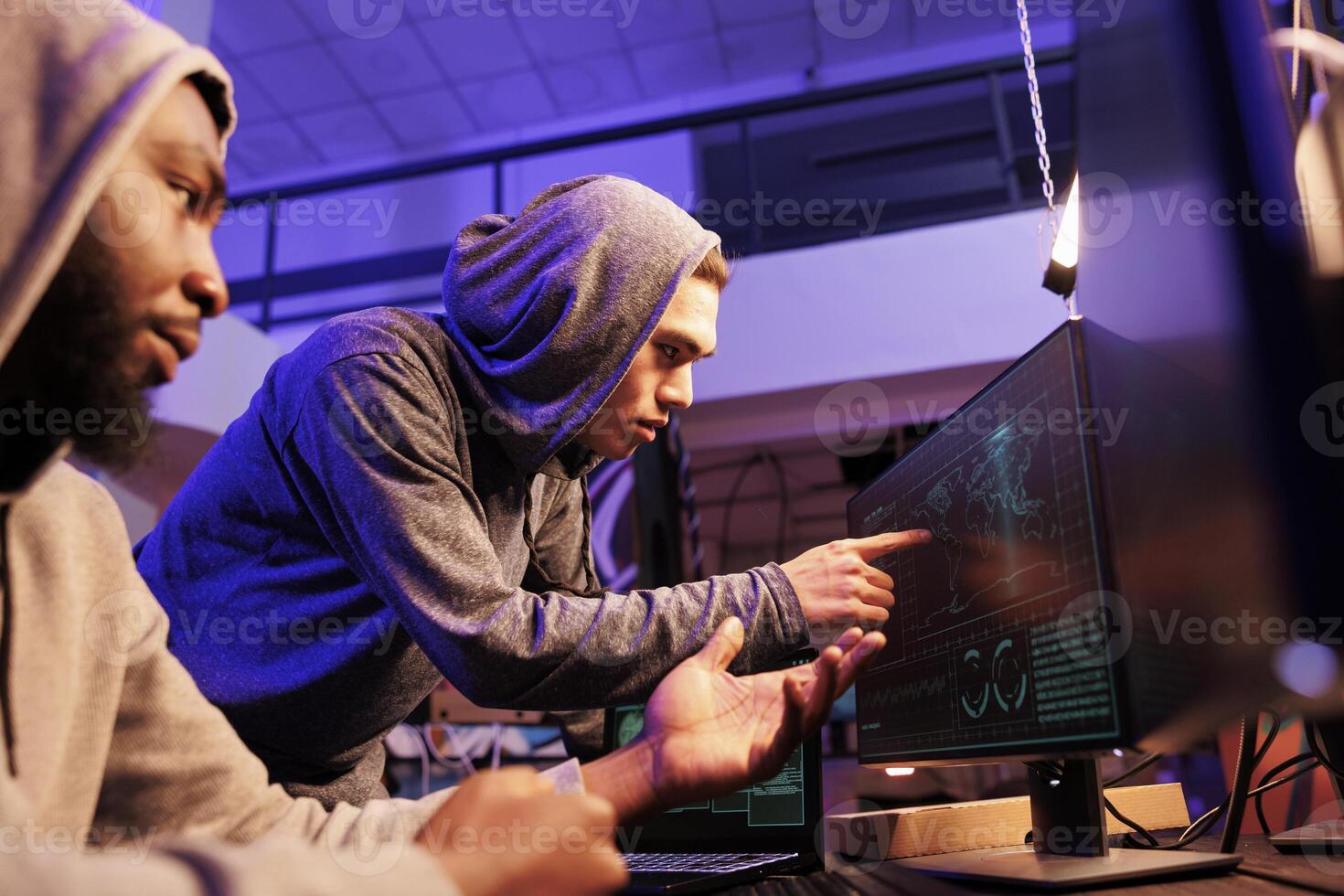 Hackers pointing at map location at computer screen while spying online. Two diverse young men in hoods using illegal spyware while doing criminal activity together at night Pro Photo