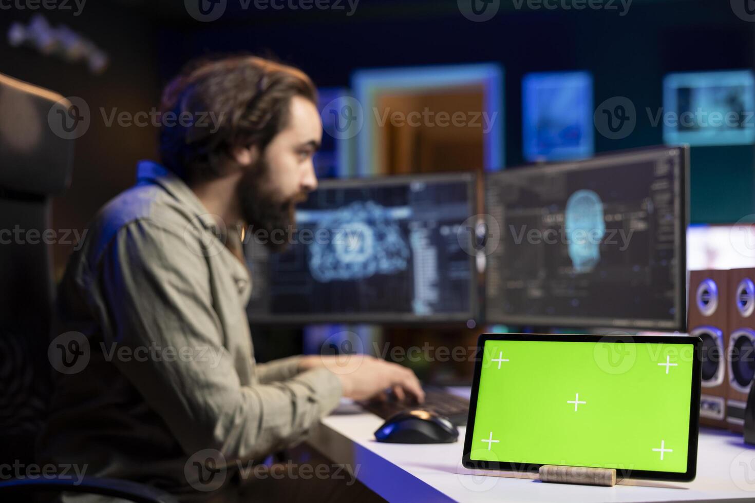 Focus on green screen device next to man in blurry background updating artificial intelligence neural networks on PC. IT admin upgrading high tech AI, mockup tablet on desk, close up Pro Photo