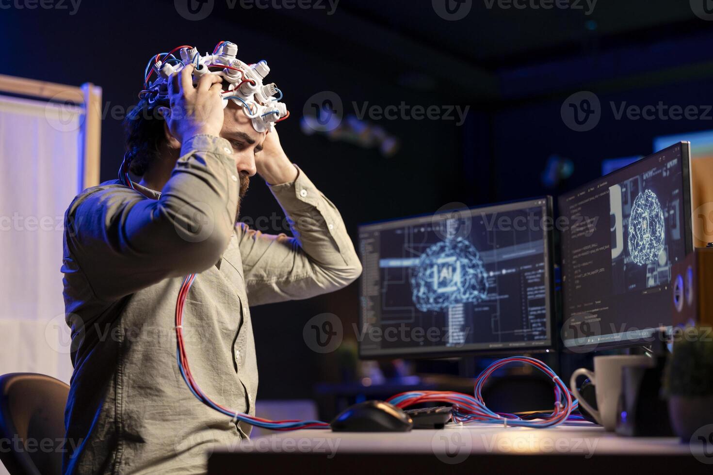 Computer scientist puts EEG headset on, starting mind upload process, trying to gain bionic powers. Man using high tech neuroscientific gear to transfer consciousness into cyberspace Pro Photo