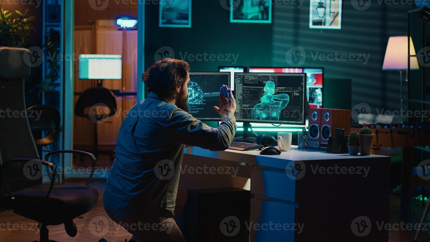 Man jumping out of chair from shock after being greeted by sentient AI gaining superintelligence, bowing down to it. Programmer doing worshiping reverence in front of artificial intelligence, camera A Pro Photo