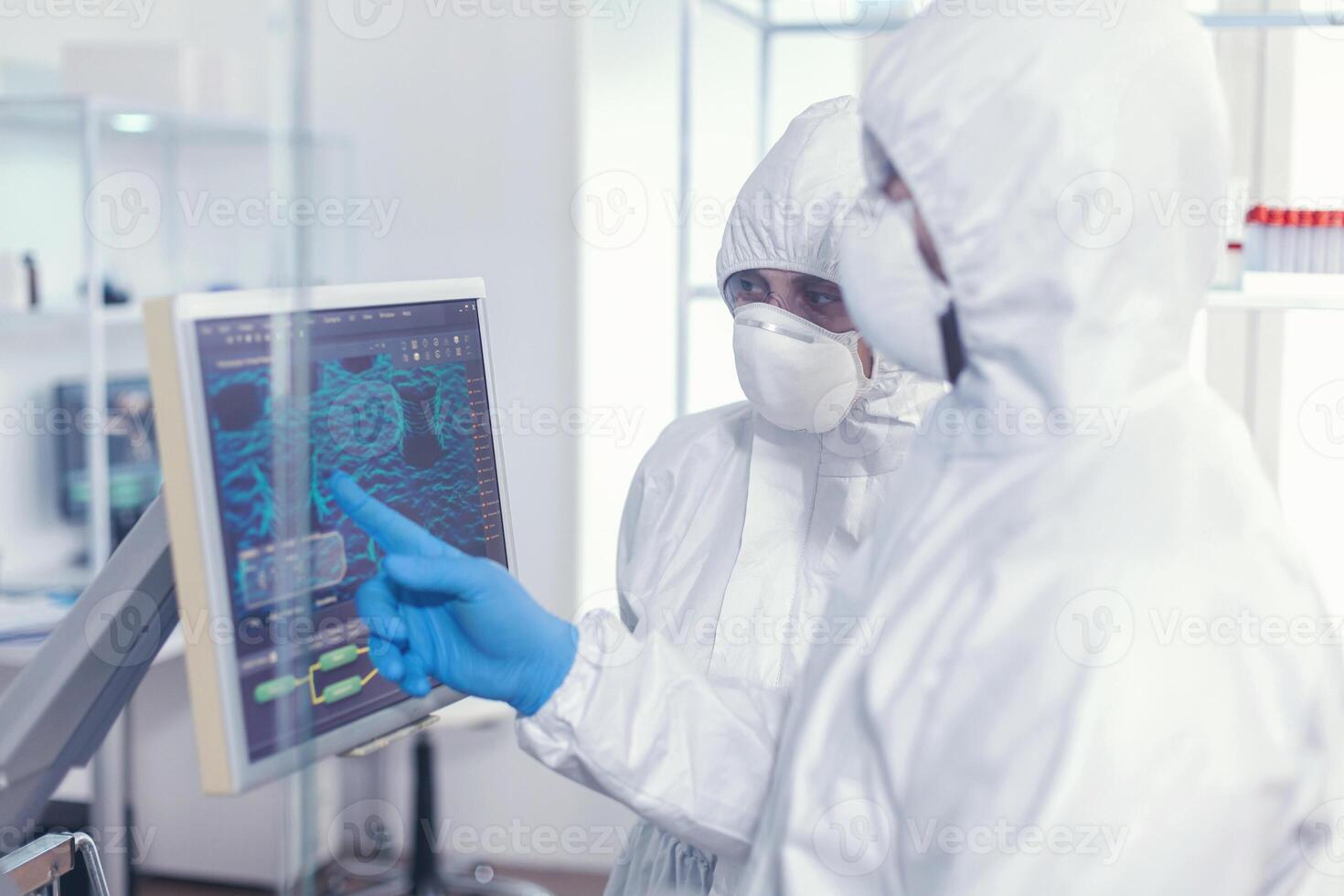 Chemist in ppe suit explainig to doctor vaccine development in modern equipped laboratory pointing on computer desktop. Doctors examining virus evolution using high tech researching diagnosis against covid19 Pro Photo