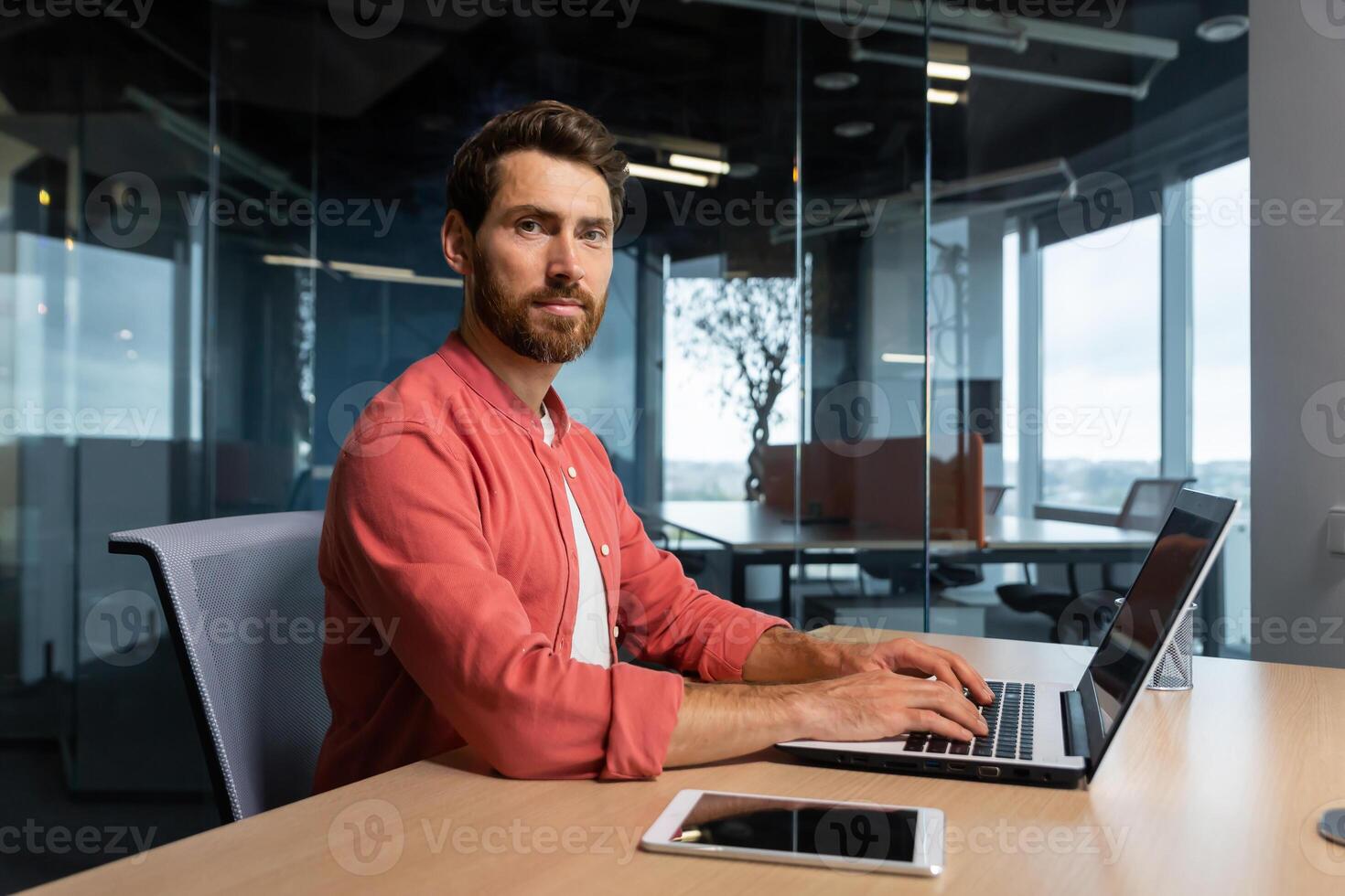 Portrait of mature programmer team leader man with beard and in red shirt is concentrating and thinking looking at camera , developer working inside modern company using laptop for coding. Pro Photo
