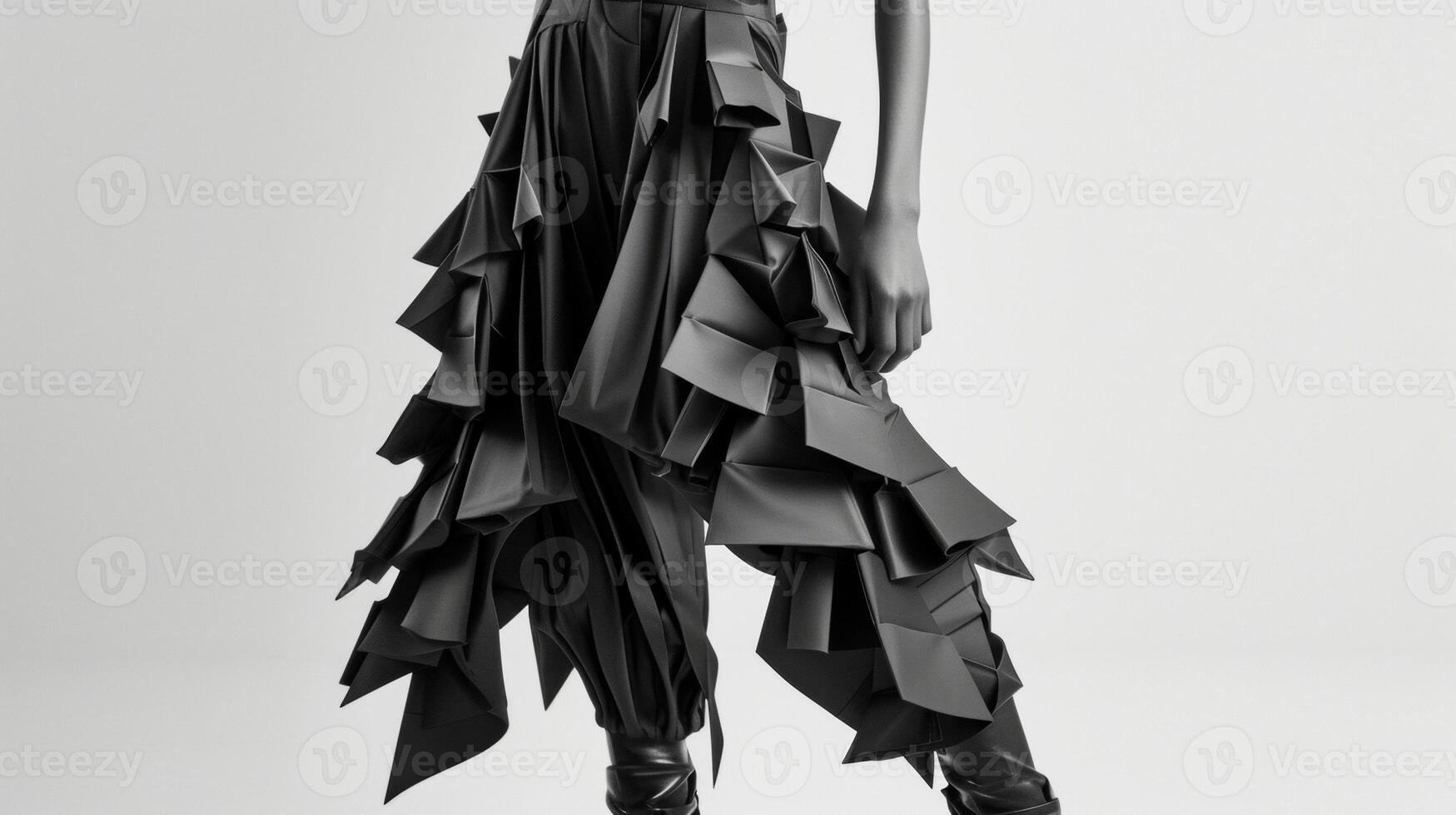 A sleek monochromatic outfit featuring a 3D printed structured top and pants with bold exaggerated features and sharp lines Pro Photo