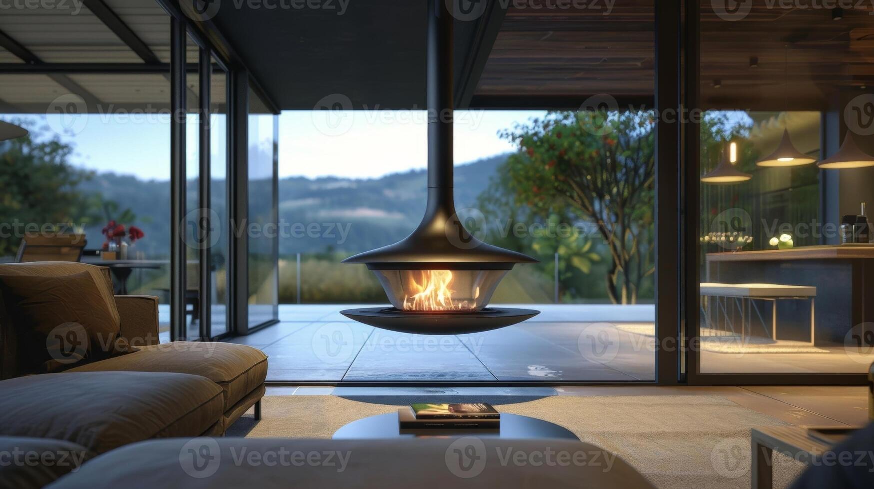 A floating fireplace made of steel and glass hangs suspended from the ceiling its minimalistic design and remotecontrolled functionality adding a touch of futuristic 2d flat cartoon Pro Photo