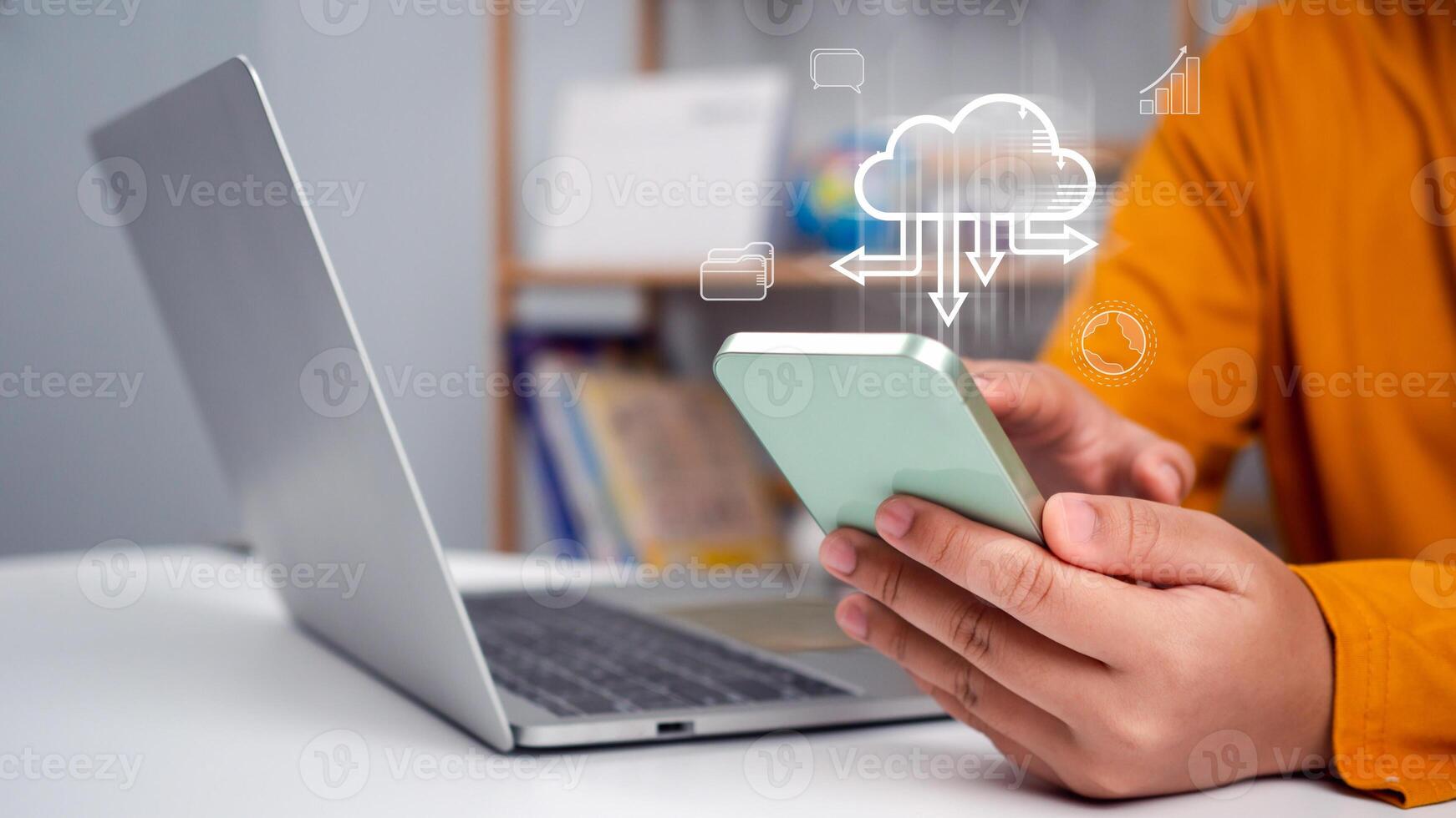 Businesswoman downloading business data from internet network showing usage of big data network and cloud computing system. Pro Photo
