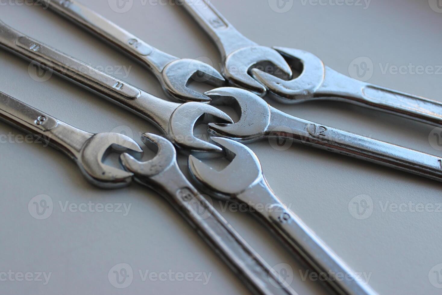 Connected open end wrenches isolated on white angle view stock image Pro Photo