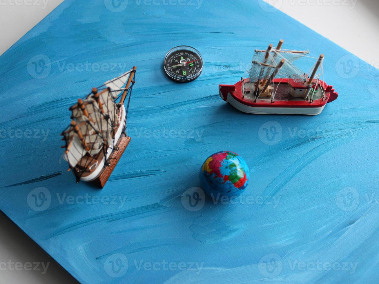 A board painted with an ocean pattern with models of sailing ships, a globe and a compass on it Pro Photo