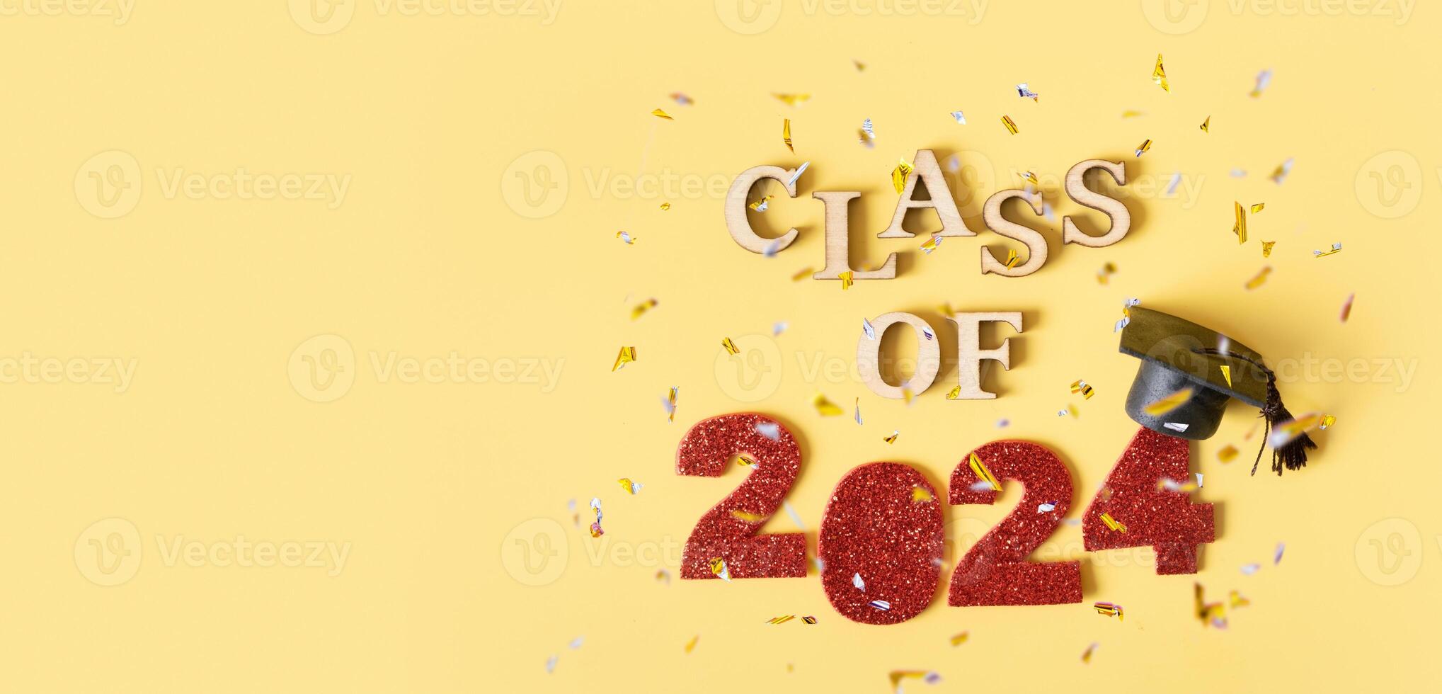 Class of 2024 banner concept. Red number 2024 with graduated cap and confetti top view Pro Photo