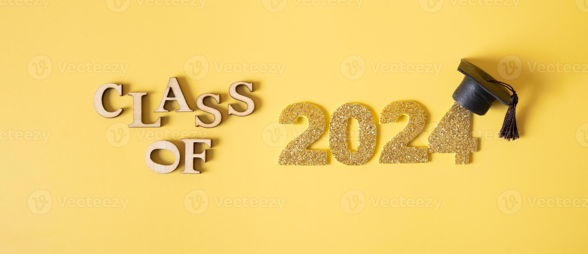 Class of 2024 concept. Number 2024 with graduated cap on yellow background Pro Photo
