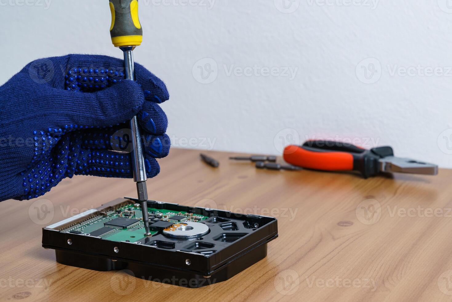 The hand of a man in a glove is repairing a hard disk of a personal computer with a screwdriver. Pro Photo