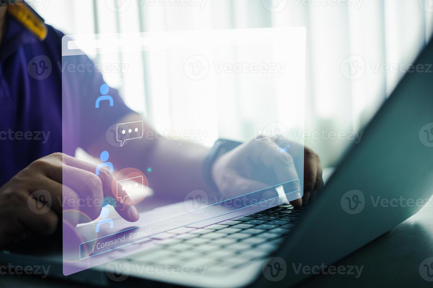 Chatbot conversation. Person using online customer service with chat bot to get support. Pro Photo