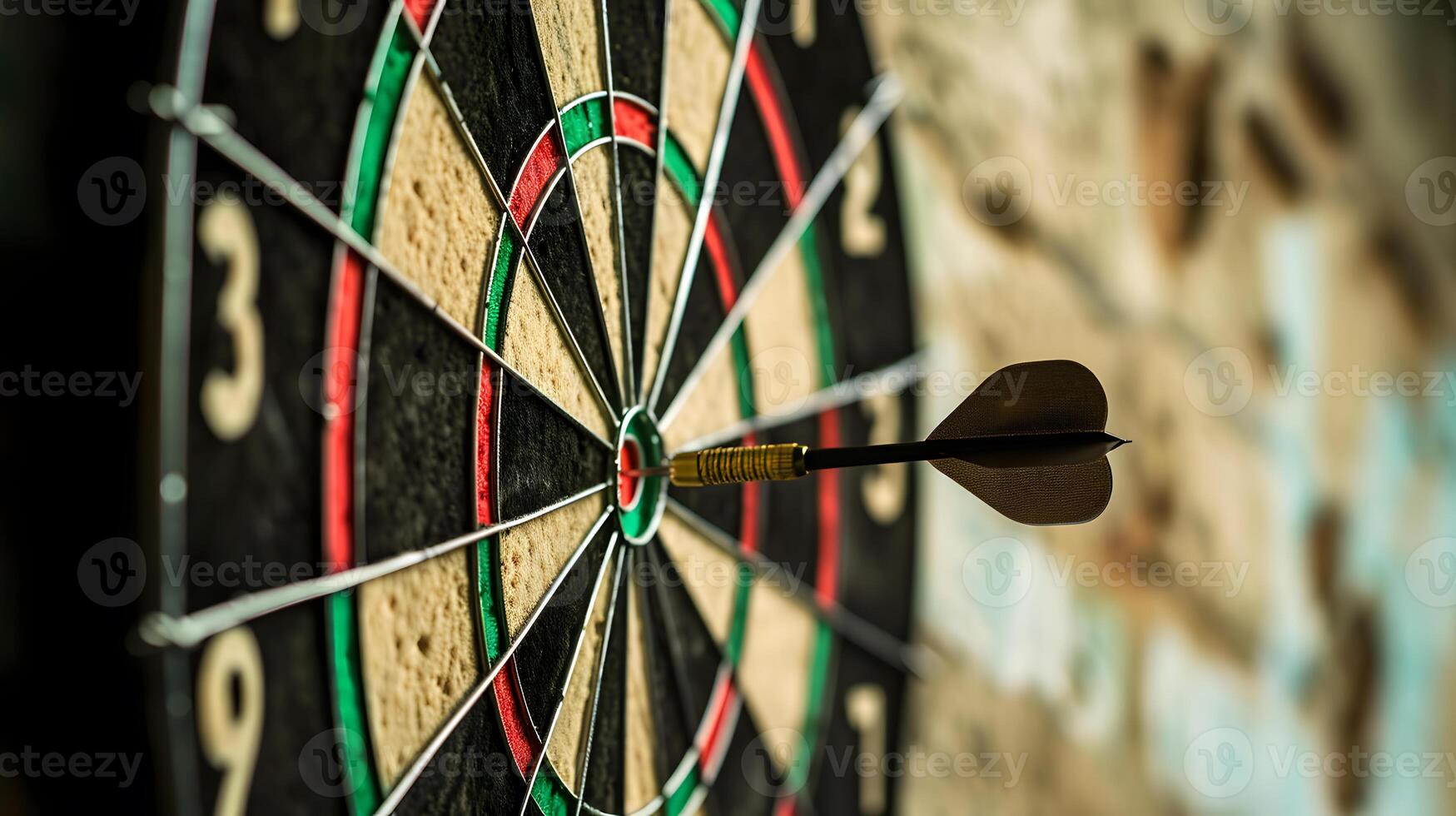 Right on target. The concept of successfully achieving goals or making the right choice. Photo of dartboard with dart in the center. Pro Photo