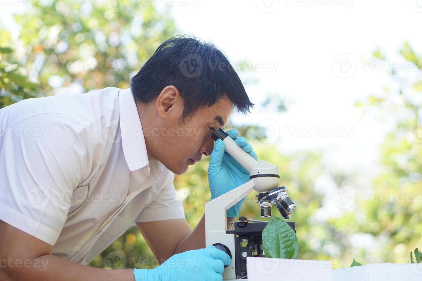 Handsome Asian man is doing science experiment by using microscope, inspect and analysis. Concept, science subject, project work. Experiment, education. Outdoor class. Pro Photo
