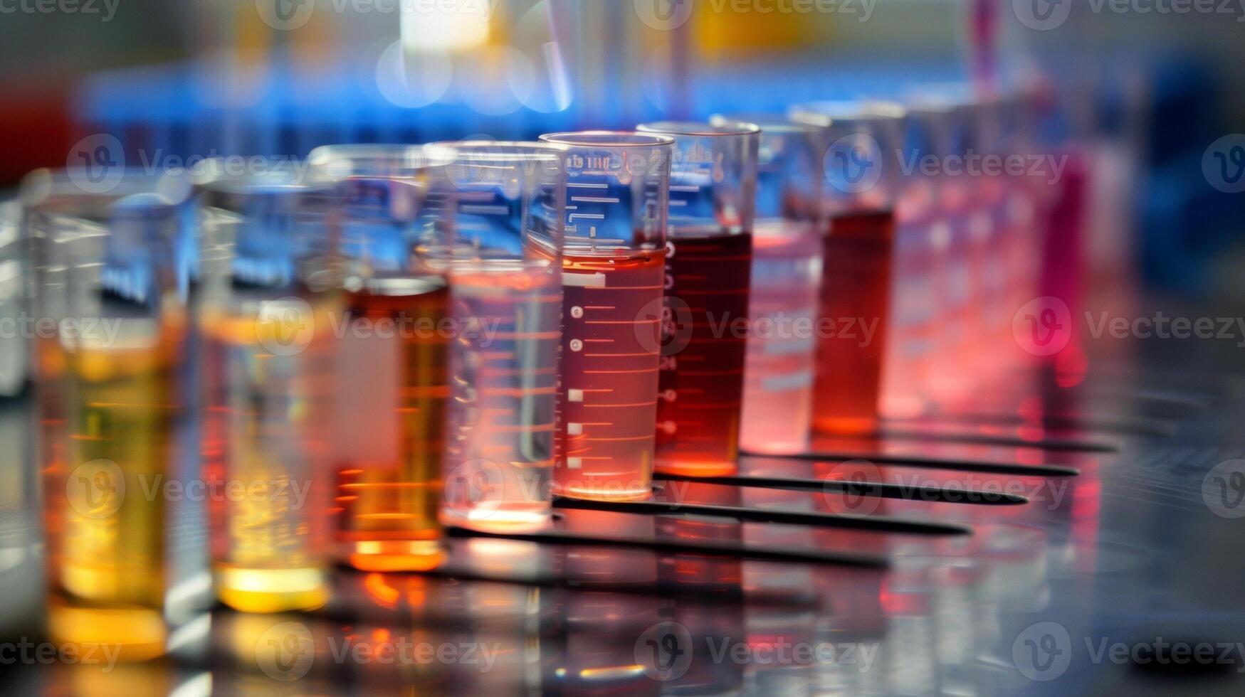 A set of test tubes lined up on a lab bench each containing a different solution. The labels read DNA genome protein sequences artificial enzymes and nutrient medium all necessar Pro Photo