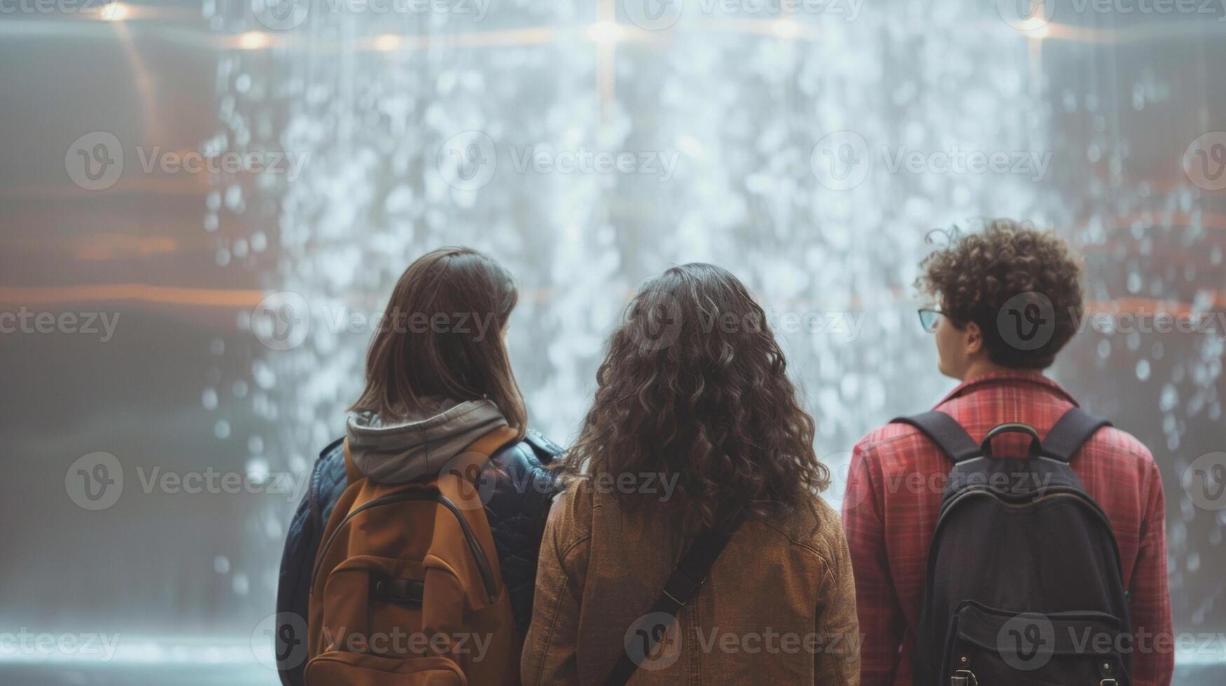 Three individuals each with a different expression on face stand together facing the silver display unaware of the camera capturing . Pro Photo