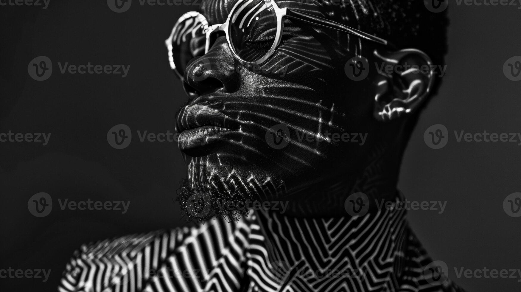 Monochromatic shock takes on a and form in this portrait of a black man. With intricate patterns and textures in shades of black and white on his ensemble he oozes charisma and style. Pro Photo