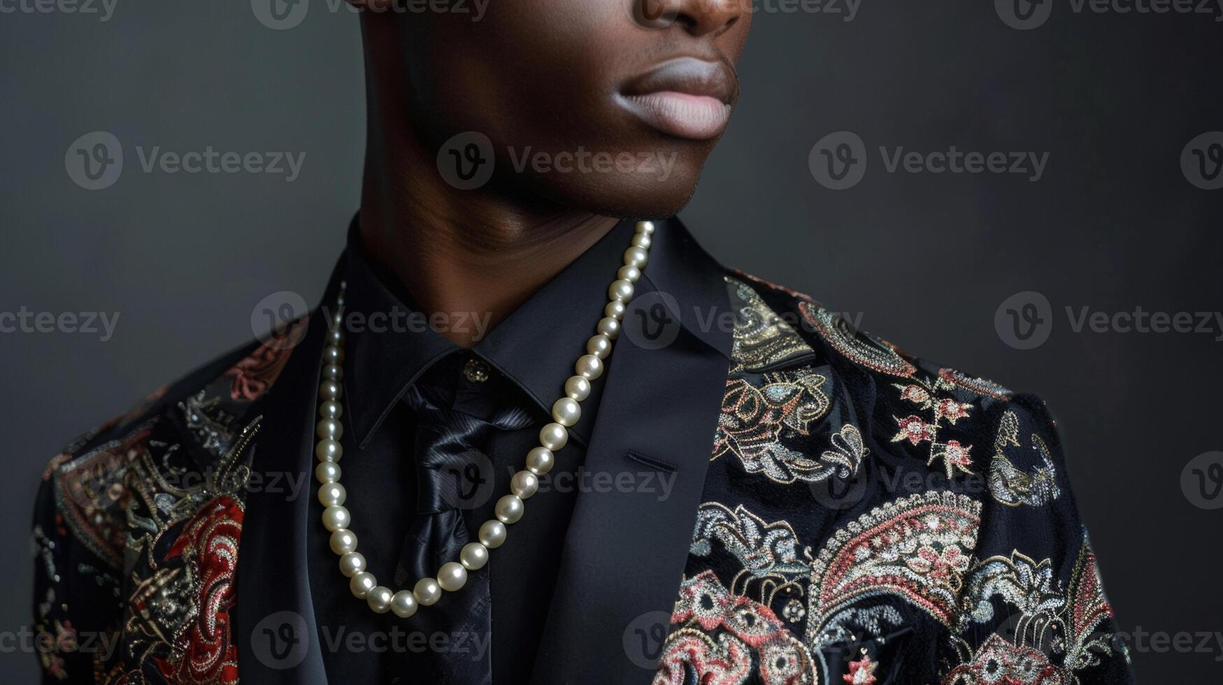 A dapper black man exudes sophistication in a tailored suit with Persianinspired prints and patterns. The addition of a string of pearls around his neck adds a touch of elegance and Pro Photo