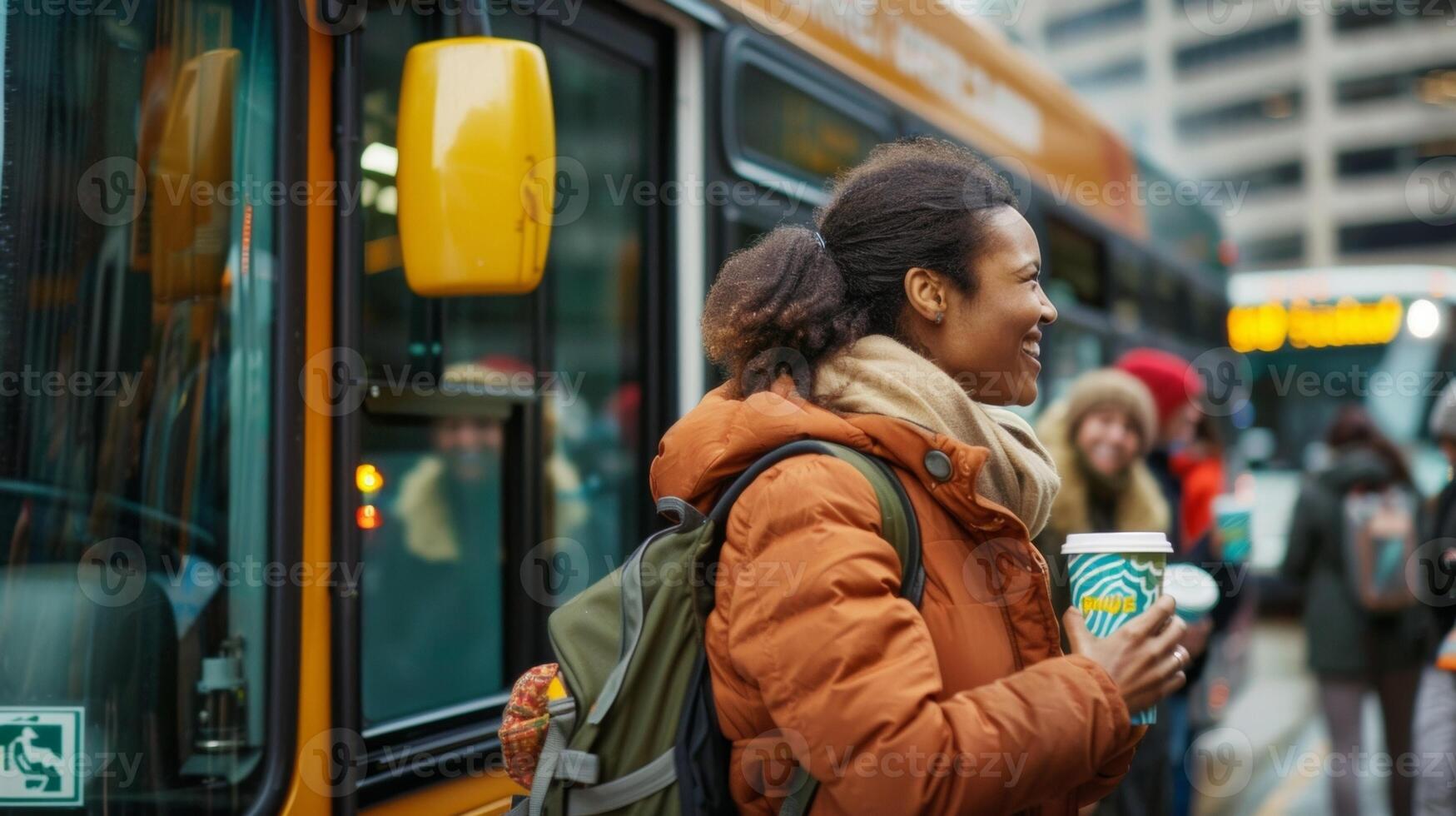 In a city a bus is pulling up to a stop with a large banner on the side that reads Powered by Biofuel. A diverse group of passengers are boarding the bus all smiling and holding reusable Pro Photo