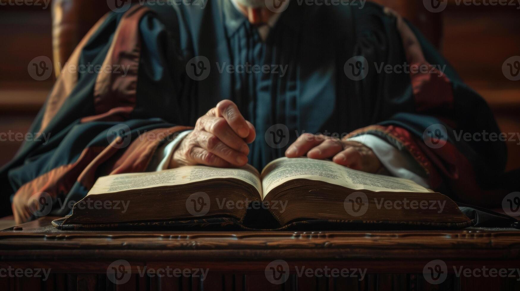 A compelling portrait of a distinguished judge their hands resting on a large book as they impart their words of wisdom from the bench. Pro Photo