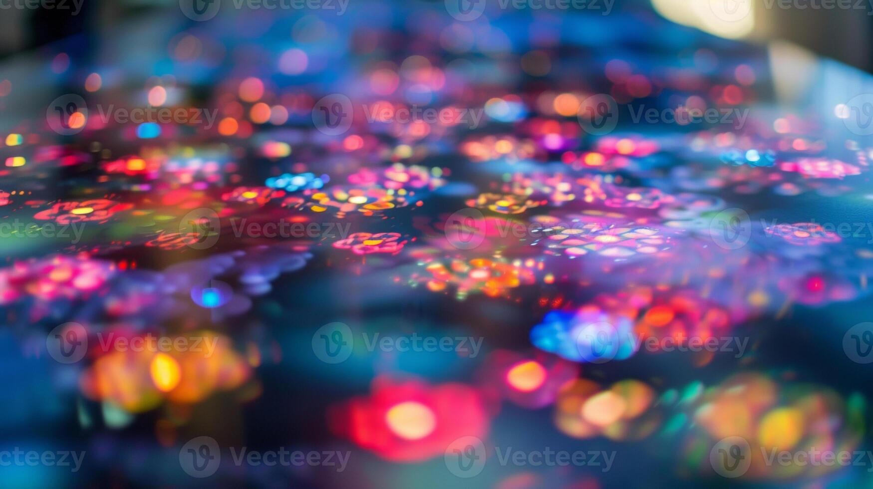 Detail of a table surface covered in a smart material that can display digital elements such as patterns and images. The surface seems to come to life as it swarms with everchangin Pro Photo