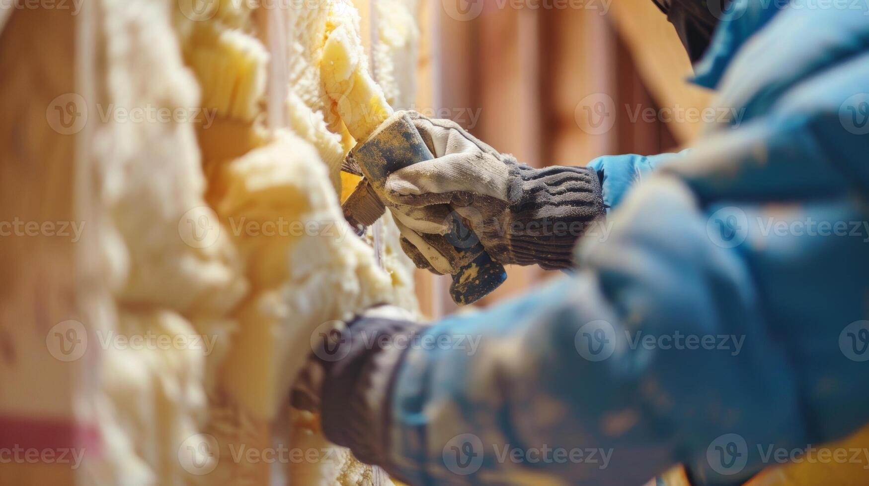 Skilled workers use specialized tools to attach layers of foam insulation to the insides of walls creating an airtight barrier for improved climate control Pro Photo