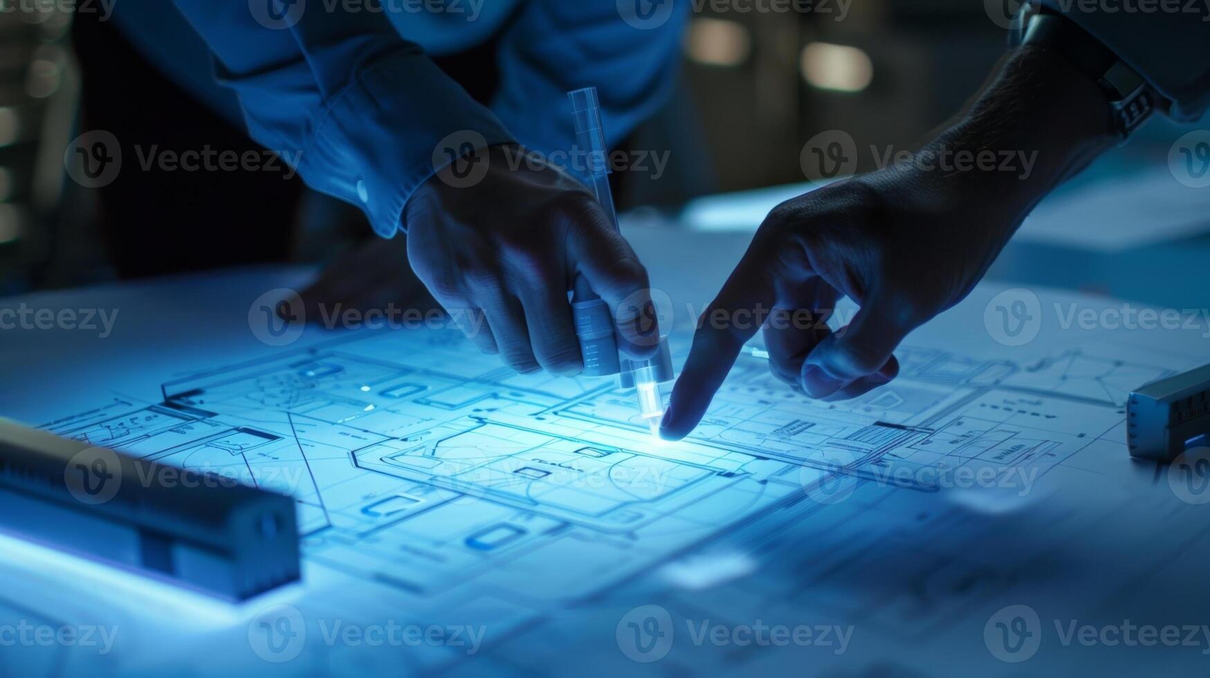 One worker using a laser pointer to highlight a particular area on the blueprint as he explains a strategy to the rest of the group Pro Photo