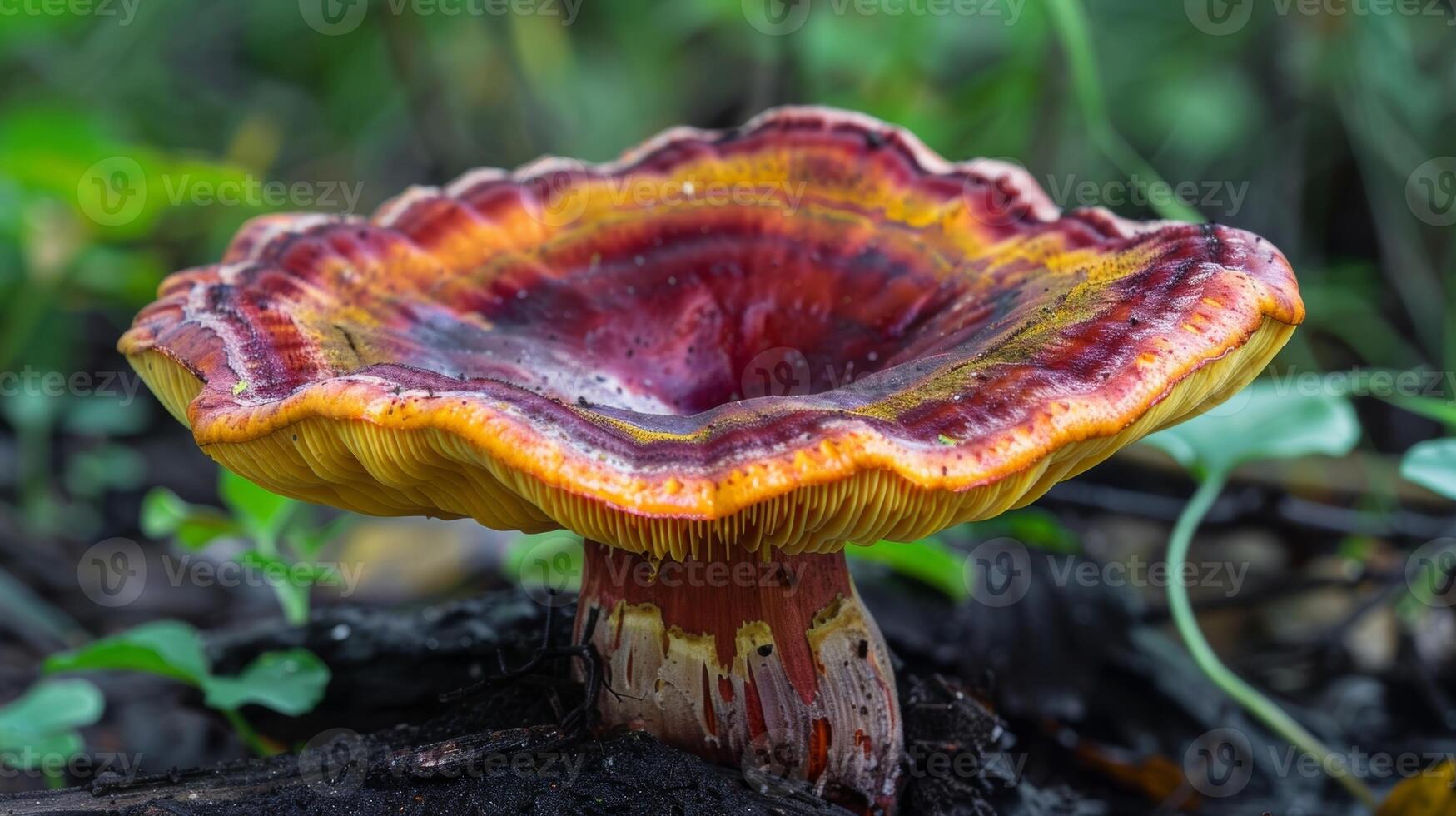 A single mushroom with a gradient of colors starting with a deep maroon cap and fading to a glowing amber stem Pro Photo