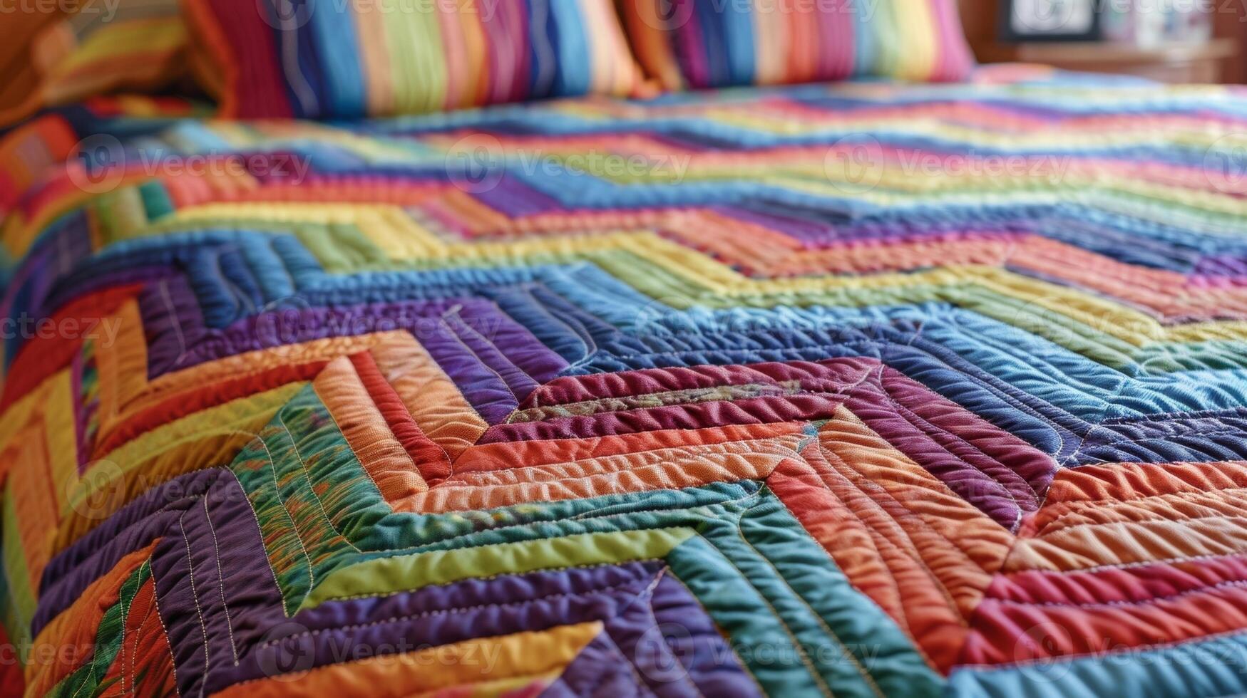 Tightly packed zigzag rows of colorful stitching give this quilted bedspread a cheerful and vibrant texture. The quilted squares create small pockets of texture adding depth and dimensio Pro Photo