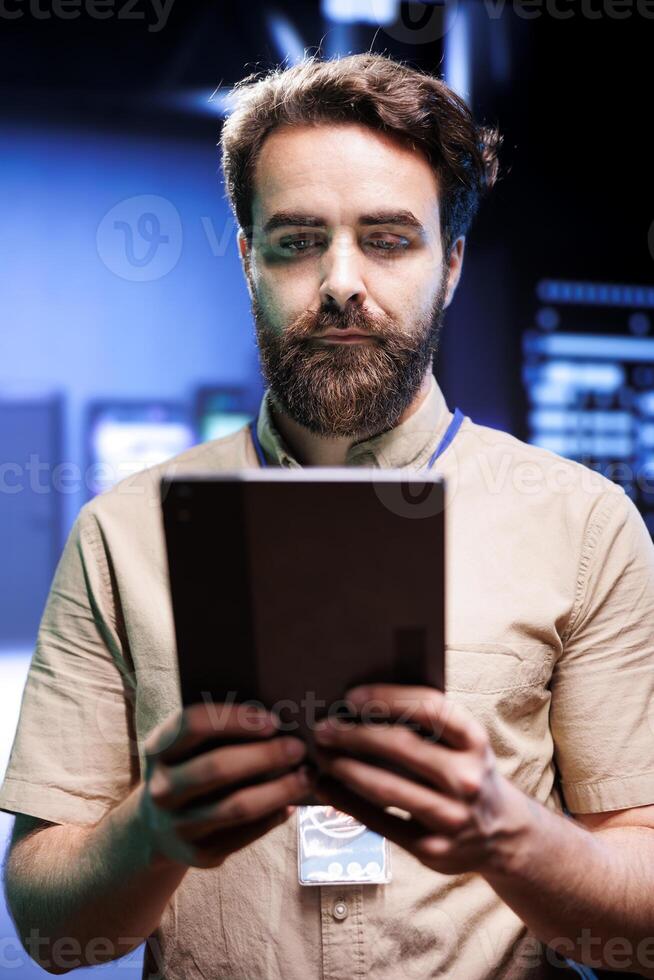 Vertical portrait of serviceman in server farm with supercomputers used for computationally intensive tasks such as scientific simulations. Employee doing annual equipment checkup using tablet Pro Photo