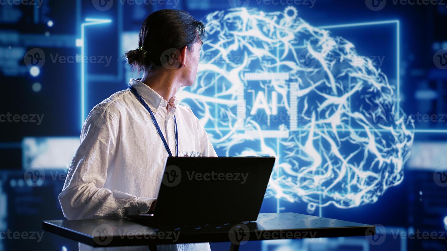 Admin using laptop to visualize artificial intelligence neural networks made up of interconnected nodes using AR holographic technology. Inspector overseeing AI systems processing information Pro Photo