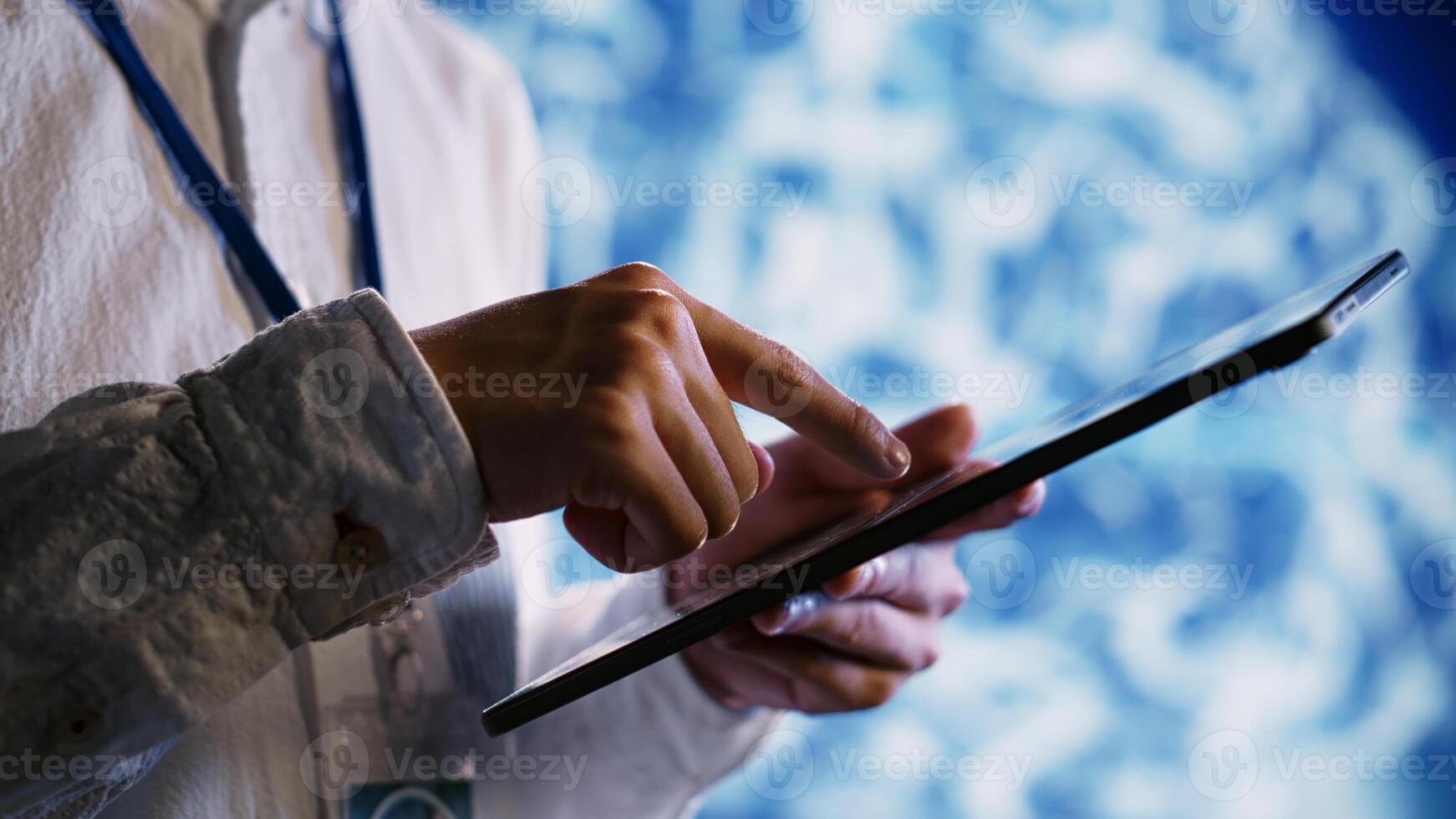 Licensed employee using tablet to maintenance artificial intelligence neural networks made up of interconnected nodes. Dilligent worker upgrades AI system processing information, close up Pro Photo