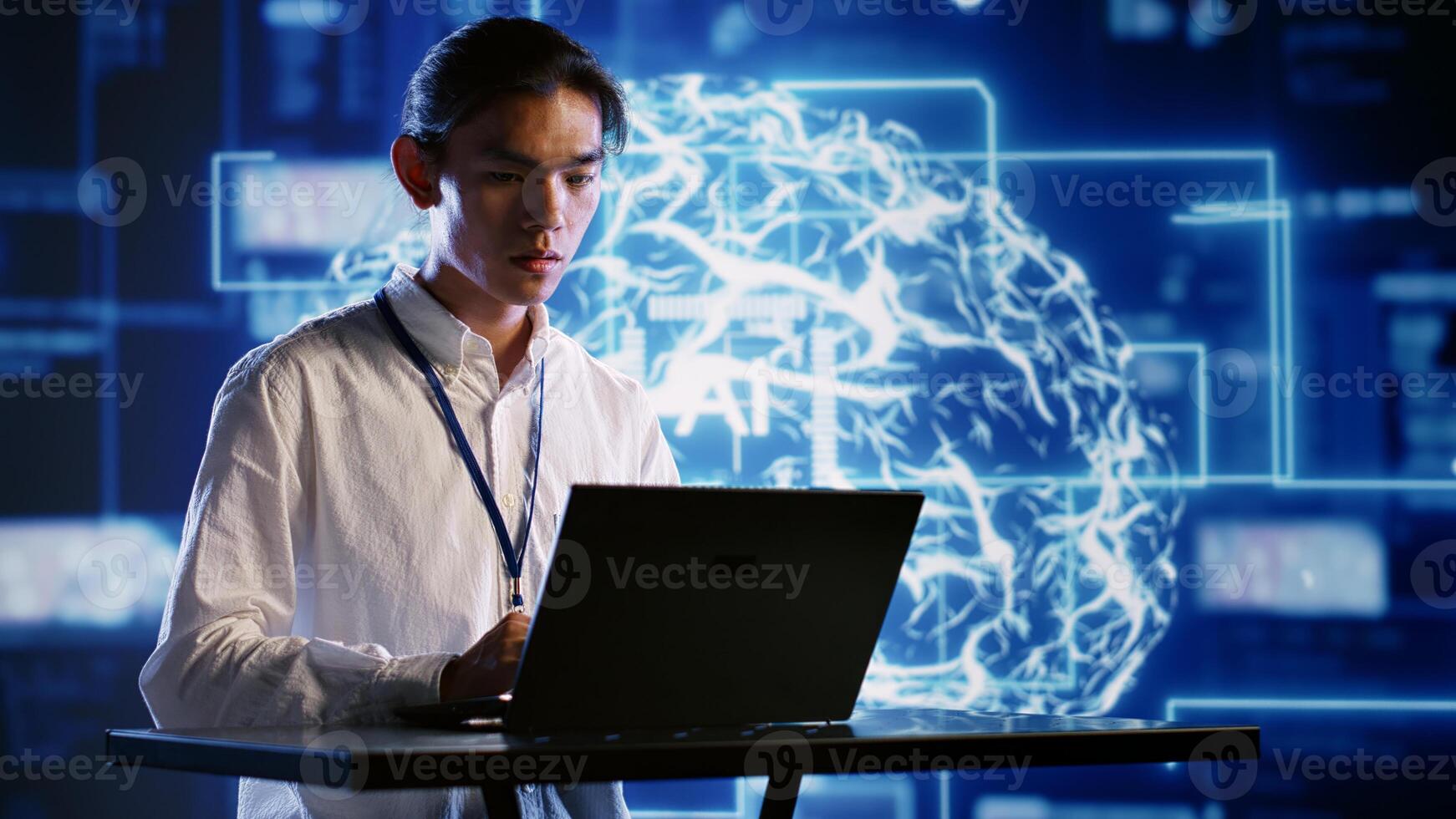 Admin using laptop to visualize artificial intelligence neural networks made up of interconnected nodes using augmented reality technology. Supervisor oversees AI systems processing information Pro Photo