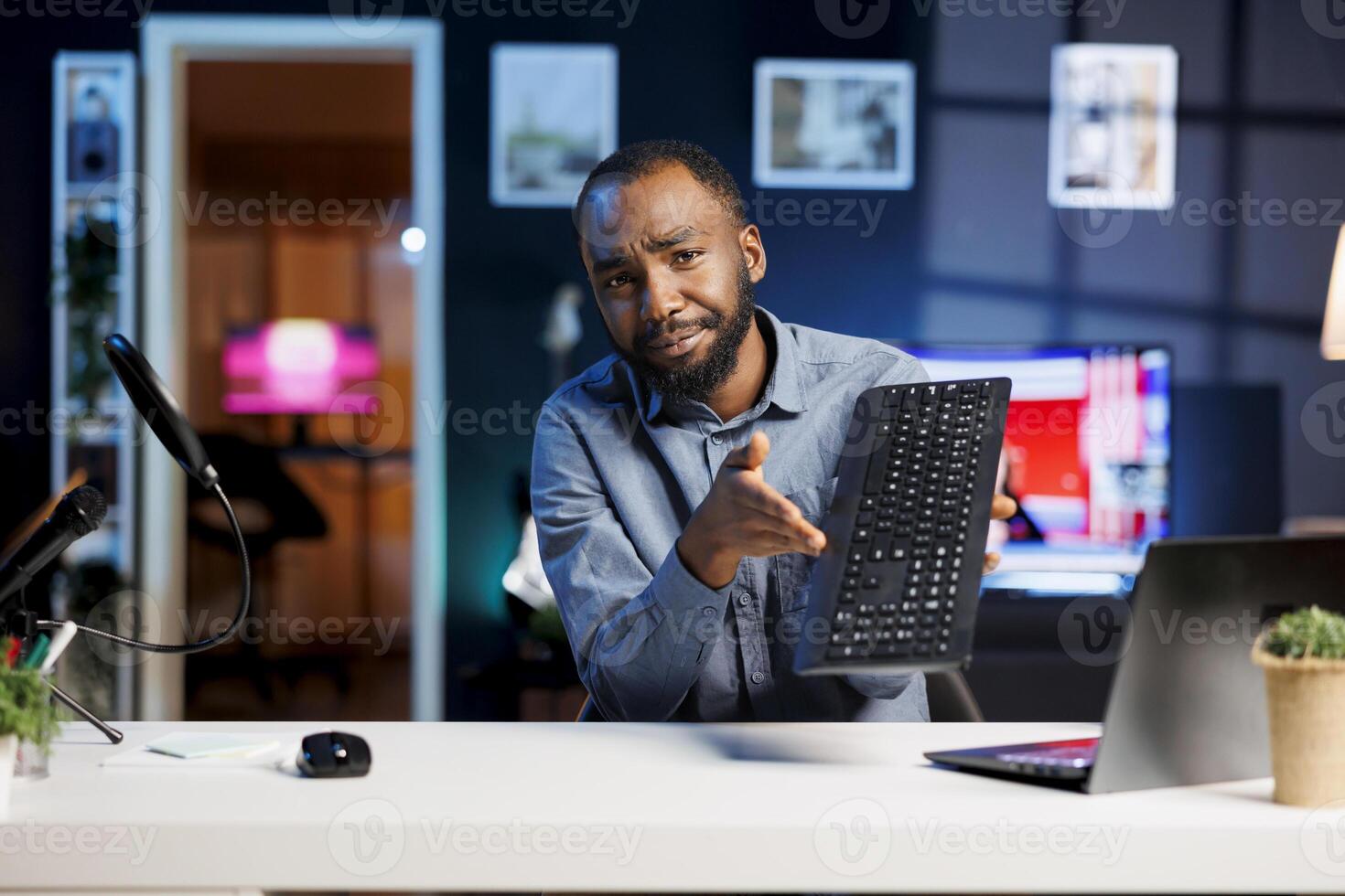 Content creator holding mechanical keyboard in hand, showing subscribers complete list of features and giving impressions on it. Tech expert showcasing computer peripheral to niche audience Pro Photo