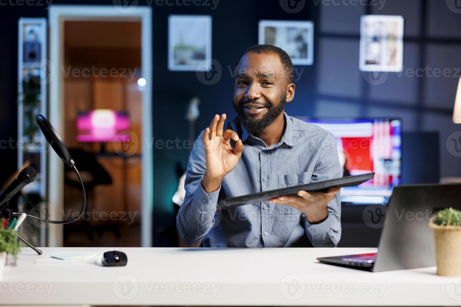 Content creator presenting gaming keyboard to subscribers, giving guarantees about precision and power. Tech expert showing ok hand sign, happy about computer peripheral after testing it Pro Photo