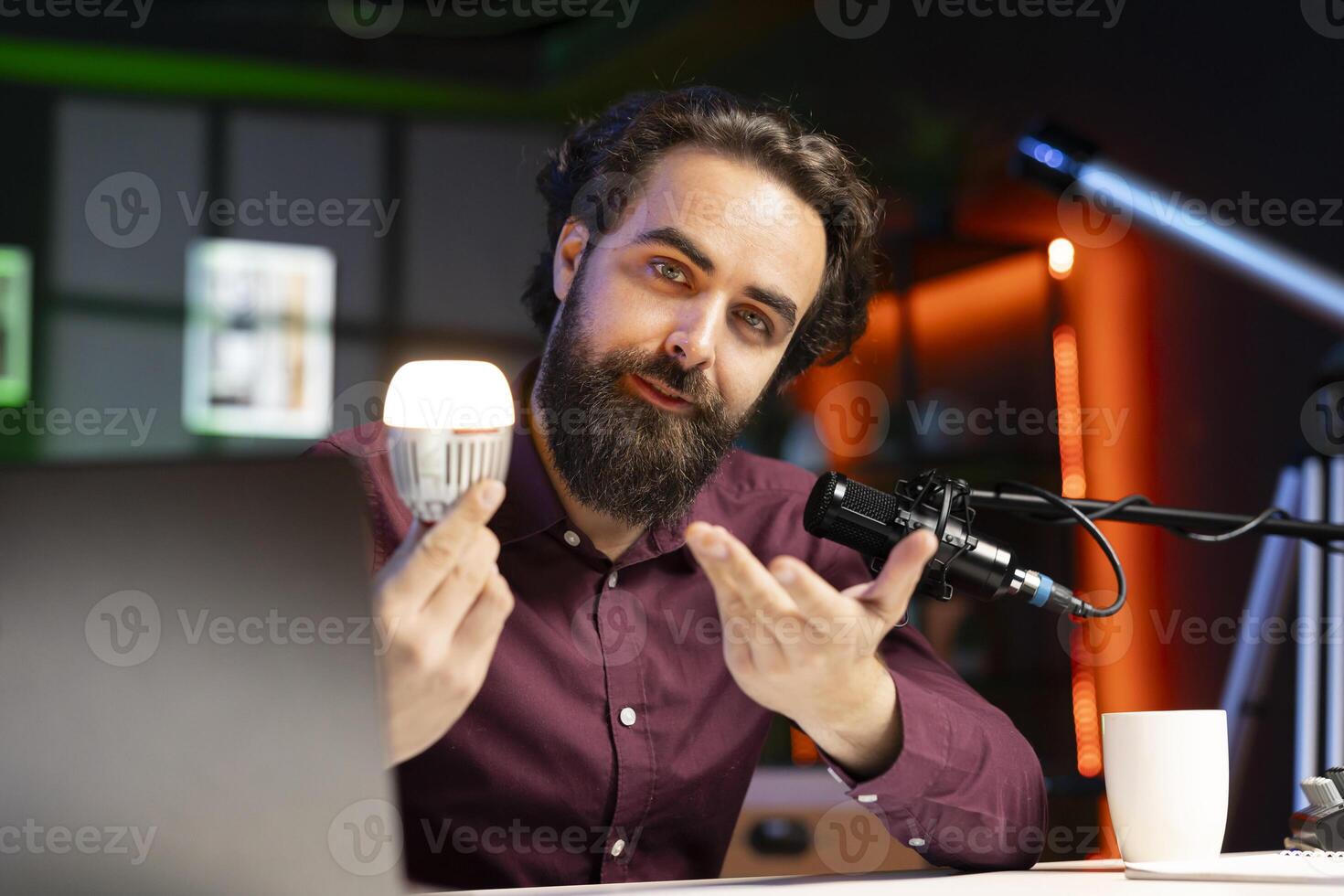 Tech guru teaching viewers how to do maintenance on smart light bulb. Content creator hosting technology show, doing tutorial on how to fix broken IoT home automation product Pro Photo