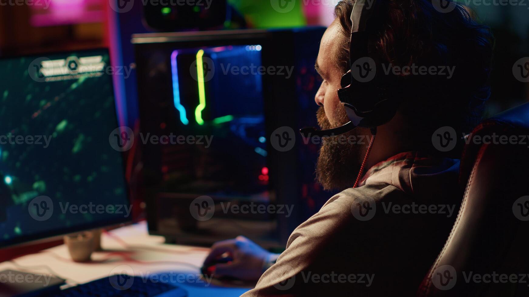 Close up shot of computer screen showing spaceship flying singleplayer game with overlay HUD showing health, fuel, ammo bars and minimap. Man playing space exploration simulation game Pro Photo
