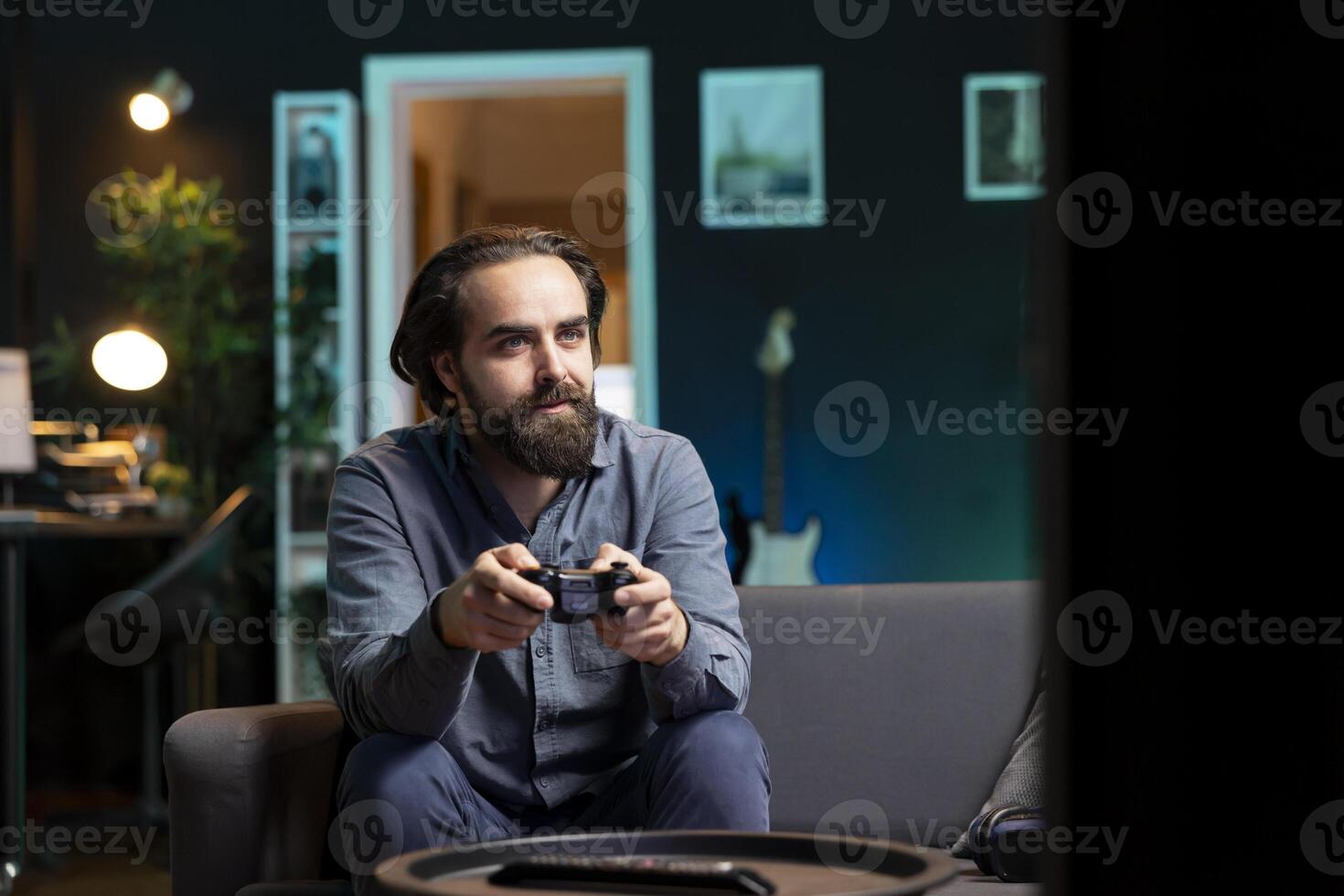 Joyous man playing videogame in home theatre, holding controller. Smiling gamer participating in PvP online multiplayer game using console system and high quality gamepad Pro Photo