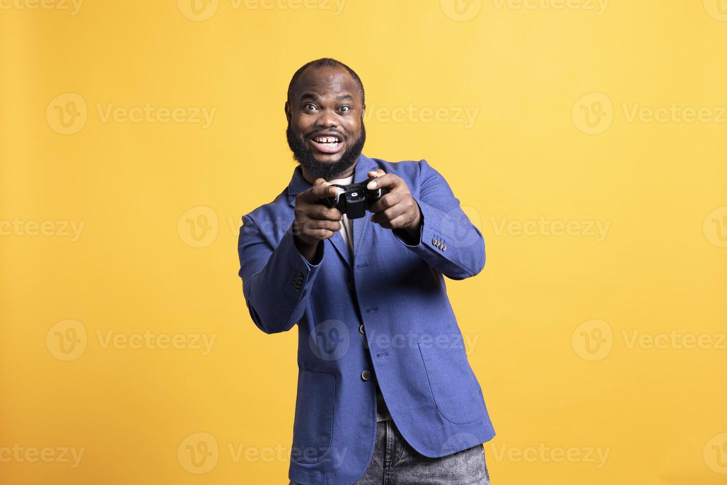 Cheerful player happy after winning gaming console game, isolated over studio background. Joyful man satisfied after being victorious in videogame, defeating all enemies using gamepad Pro Photo
