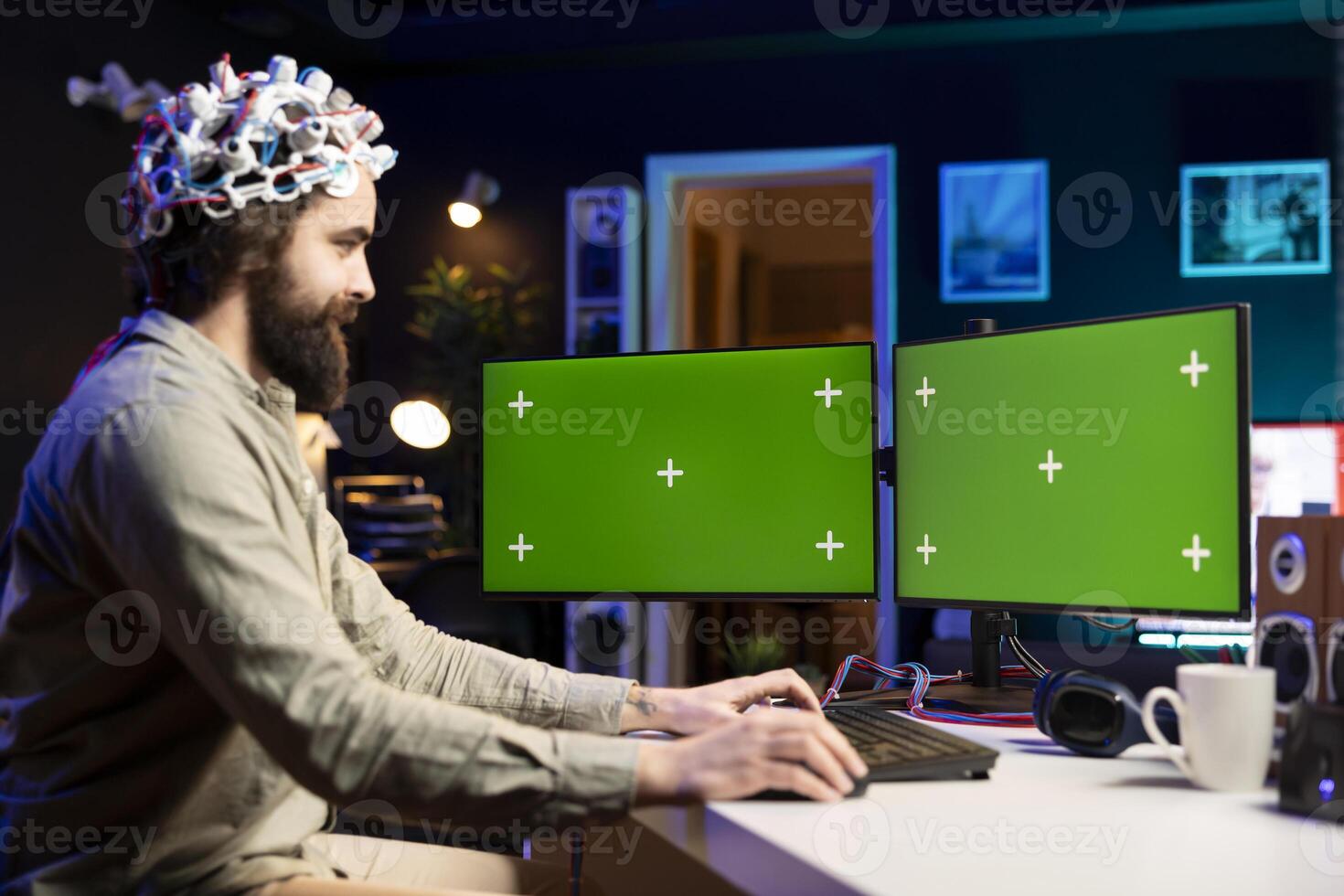 Neuroscientist using EEG headset and isolated screen multi monitor setup to upload mind into computer. Engineer using chroma key PC, experimenting with transferring consciousness into cyberspace Pro Photo