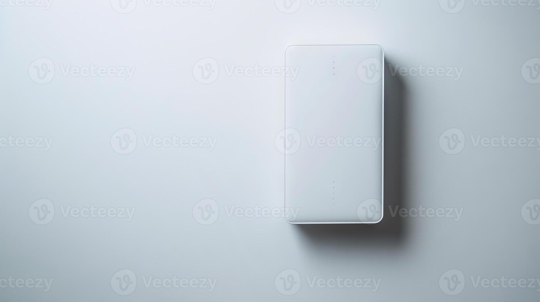 Minimalistic white Wi-Fi router against a plain wall. Concept of modern technology, wireless internet, connectivity, sleek design. Copy space Pro Photo
