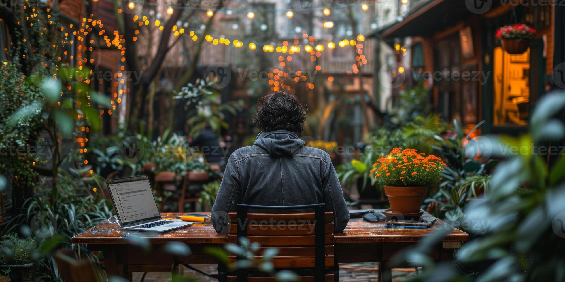 A man with a laptop at a table in a garden under a tree surrounded by greenery Pro Photo